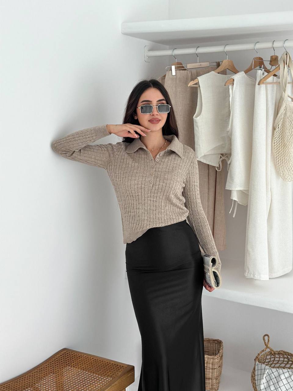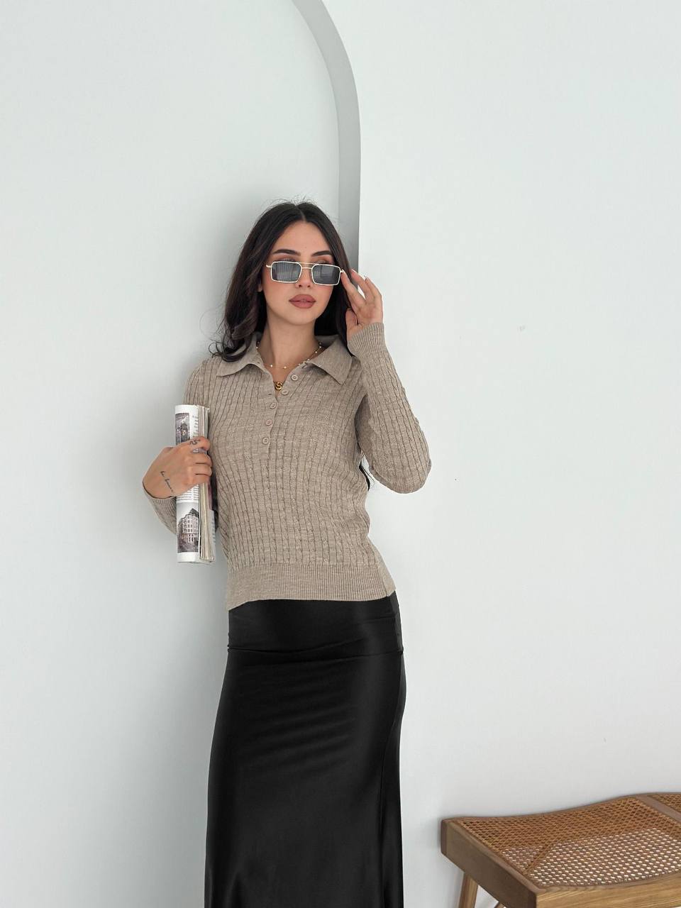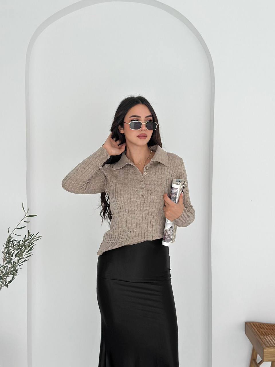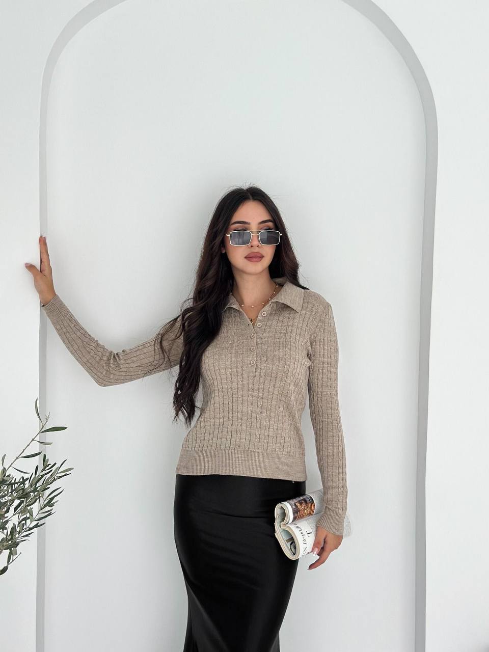 Женская Базовая Трикотажная Бежевая Кофта Поло с Воротником на Пуговицах