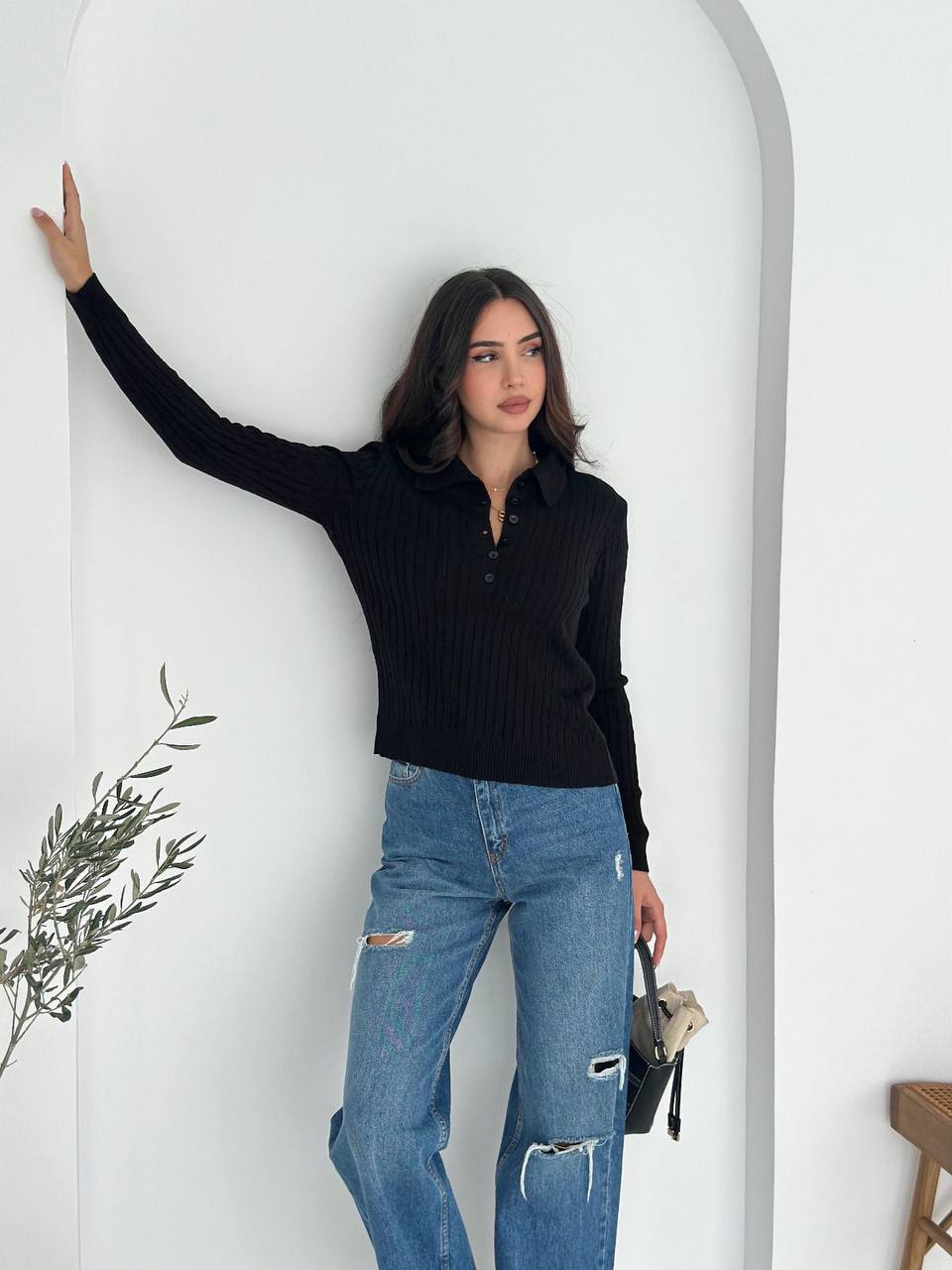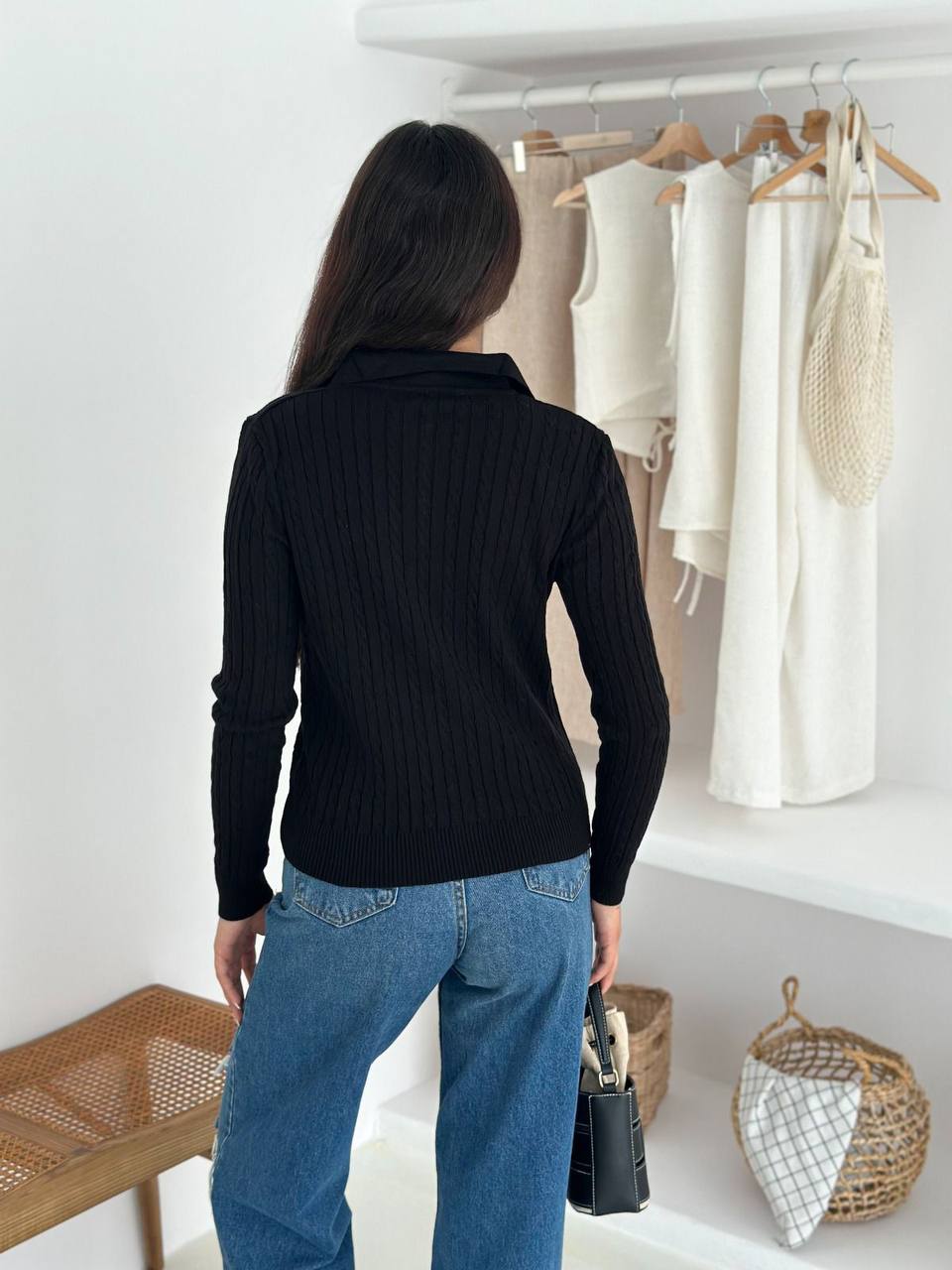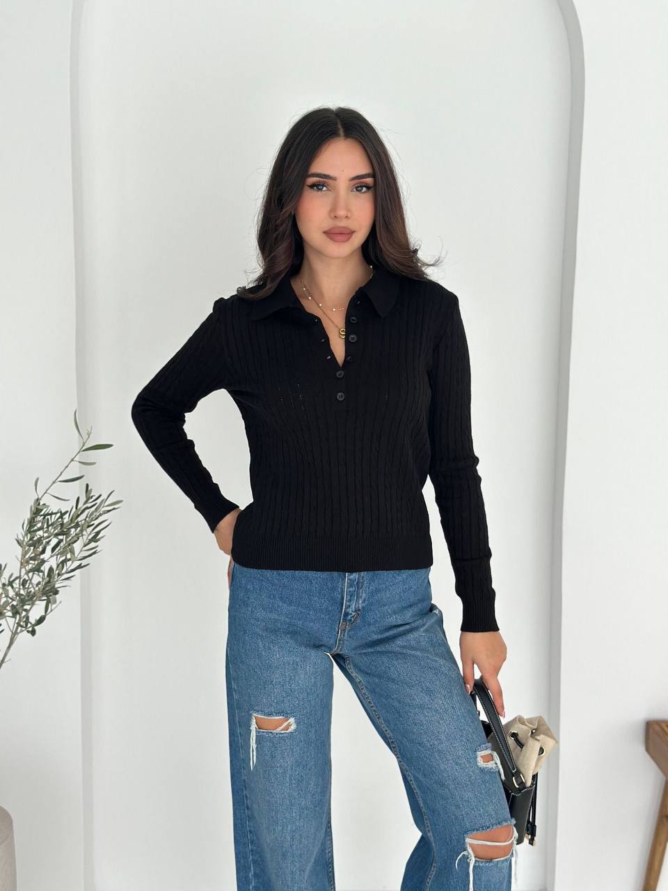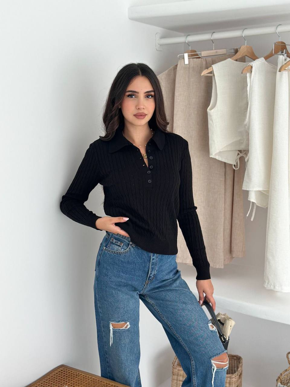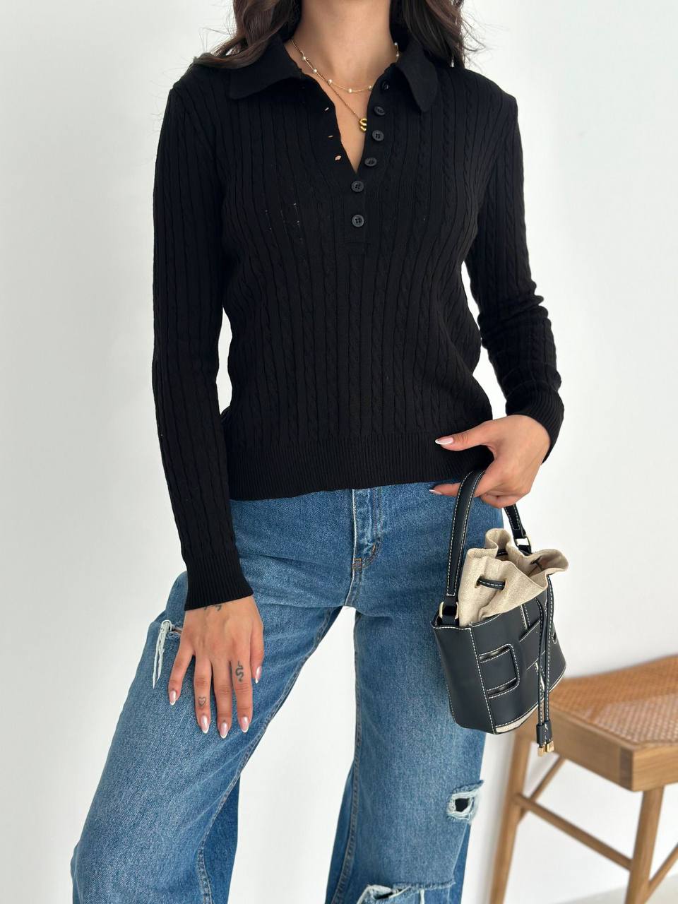 Женская Базовая Трикотажная Черная Кофта Поло с Воротником на Пуговицах