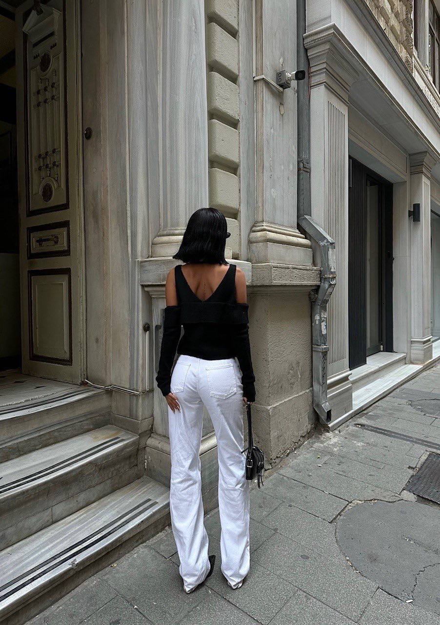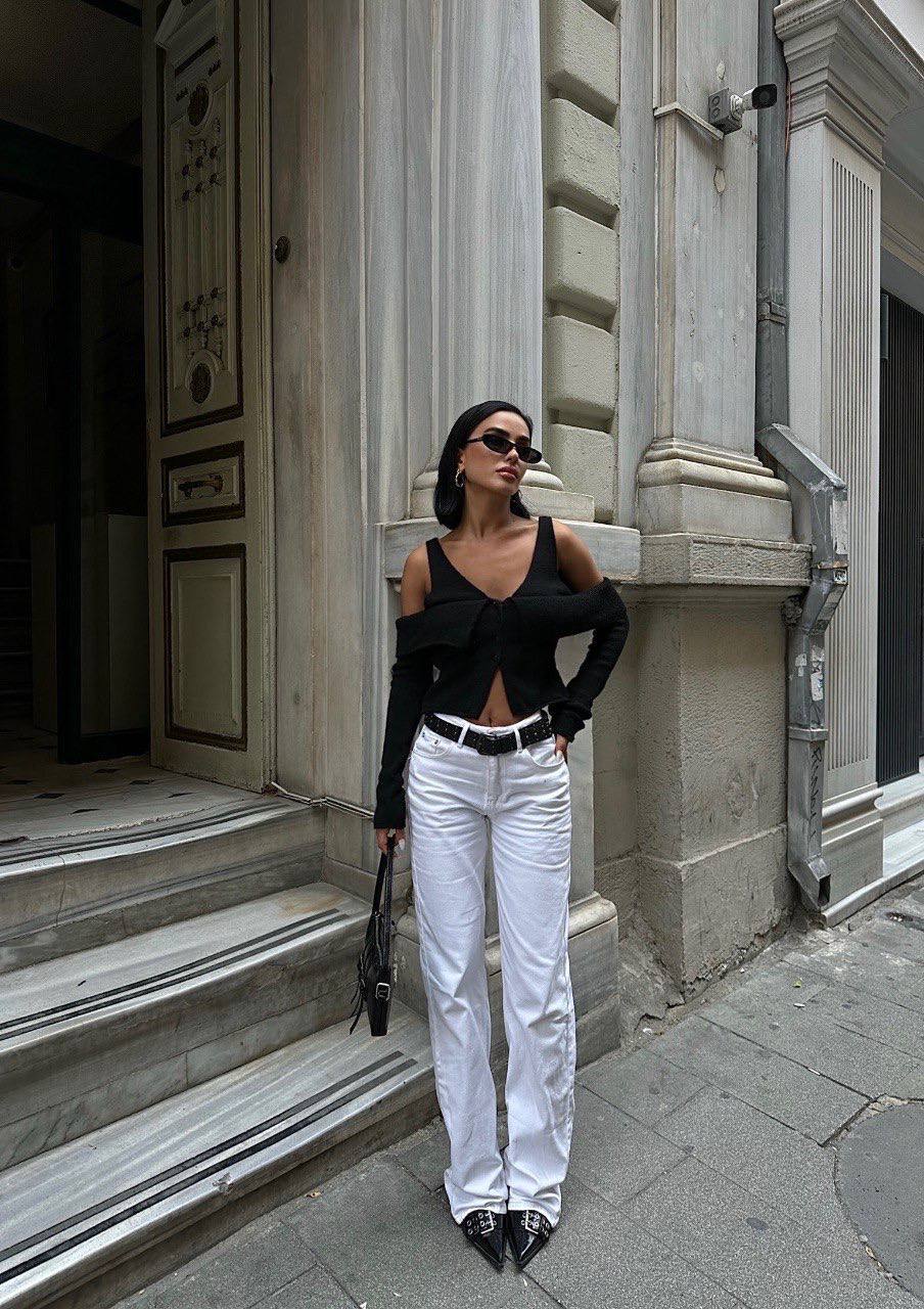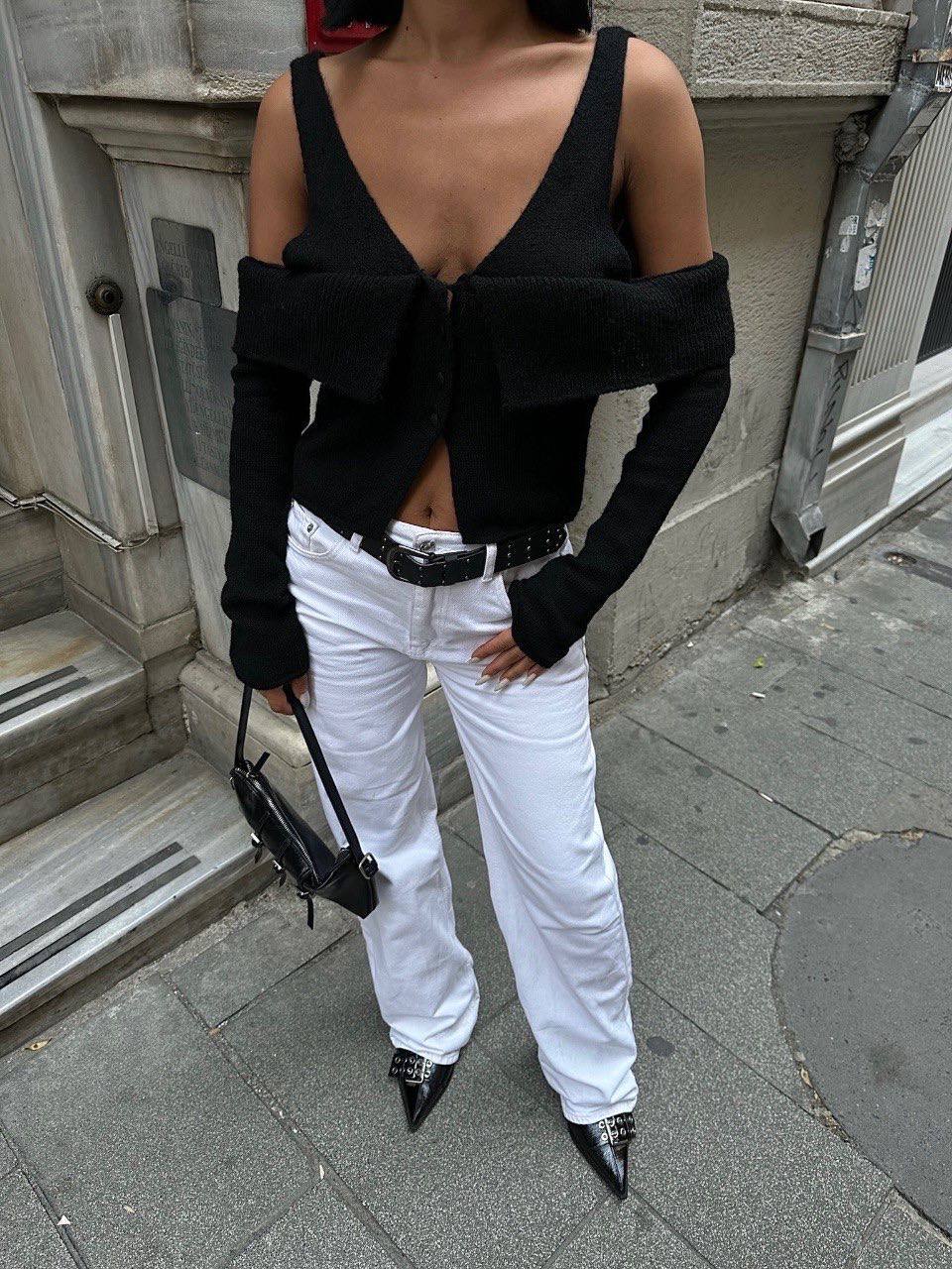 Женская Трикотажная Черная Кофта с Открытыми Плечами на Пуговицах