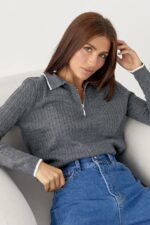Женская Трикотажная Серая Кофта Поло Косичка с Окантовкой