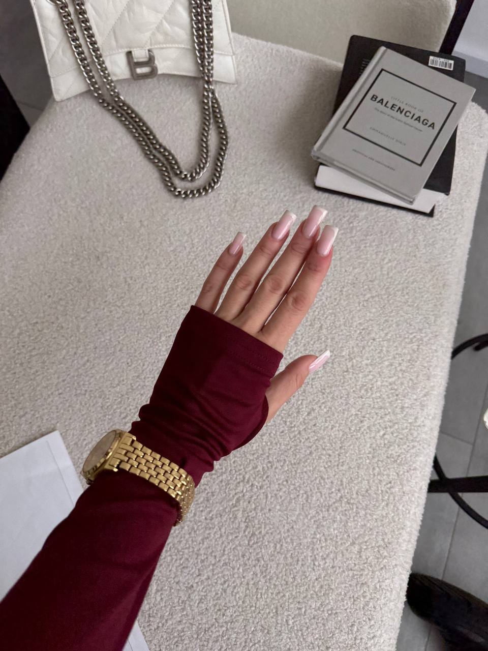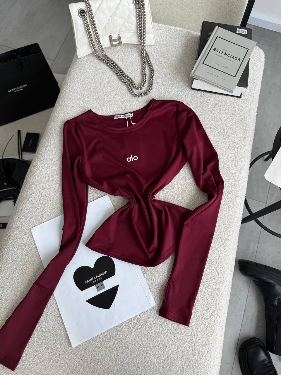 Женский Базовый Бордовый Лонгслив с Надписью и Вырезом под Большой Палец