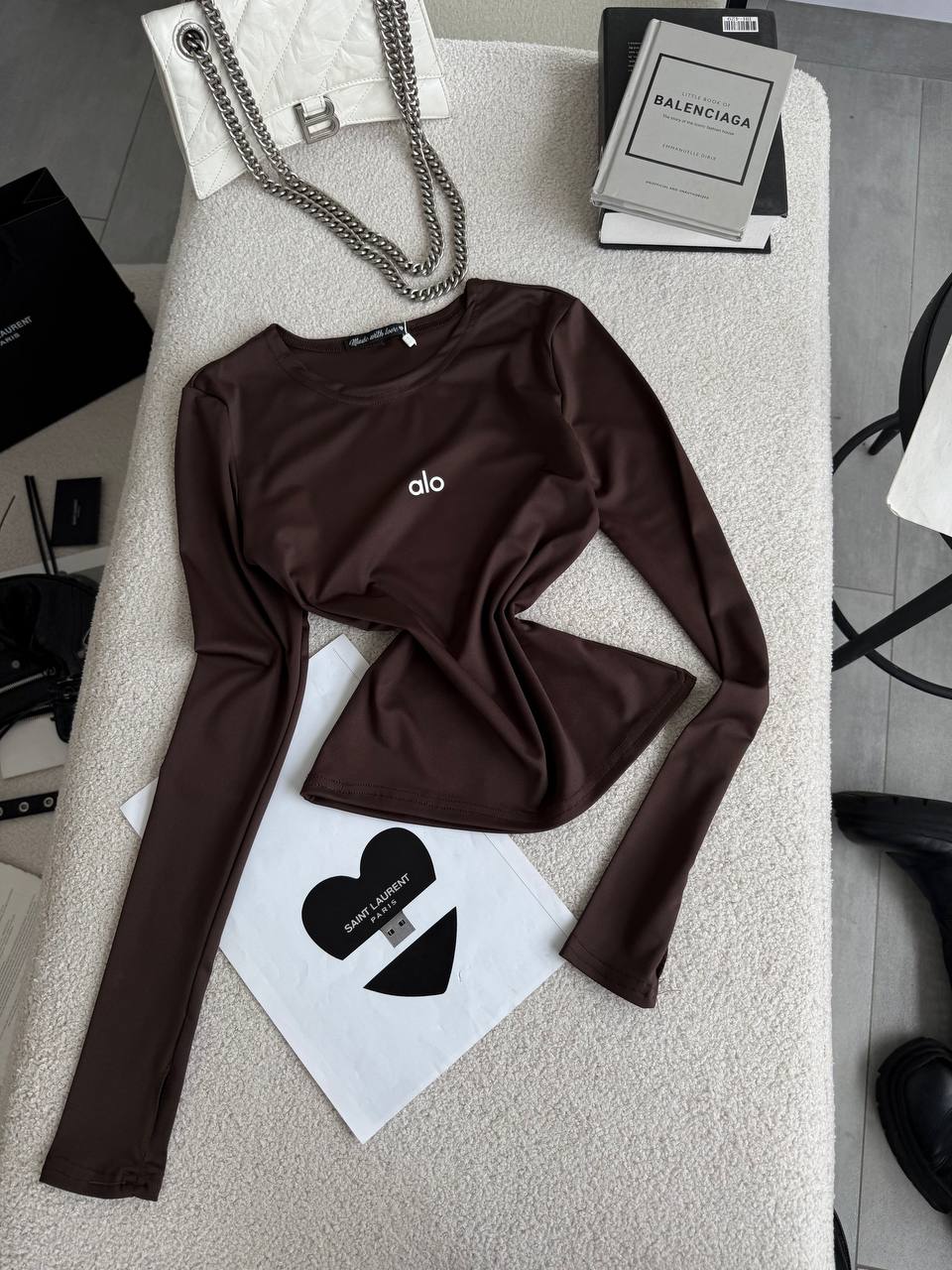 Женский Базовый Коричневый Лонгслив с Надписью и Вырезом под Большой Палец