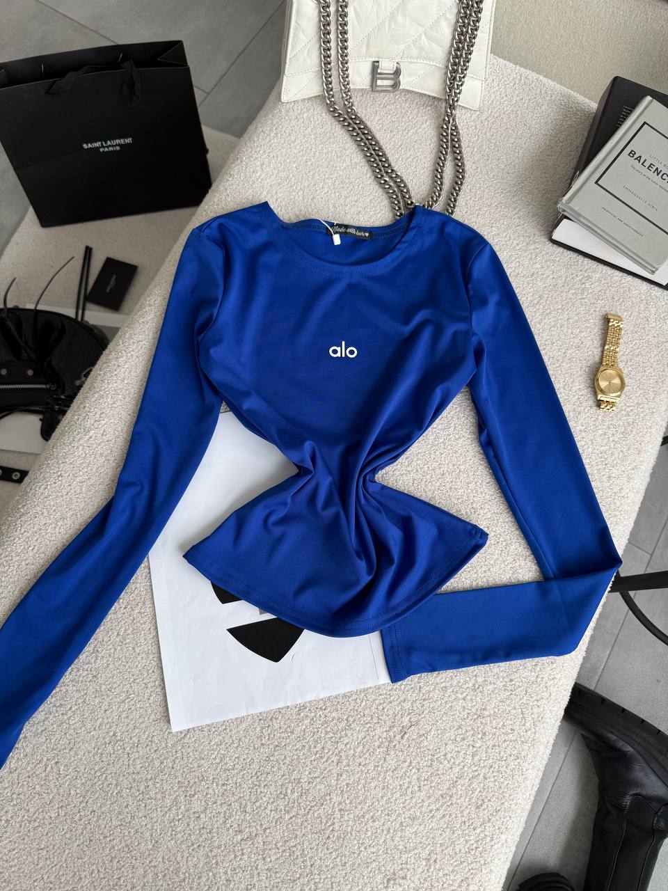 Женский Базовый Синий Лонгслив с Надписью и Вырезом под Большой Палец