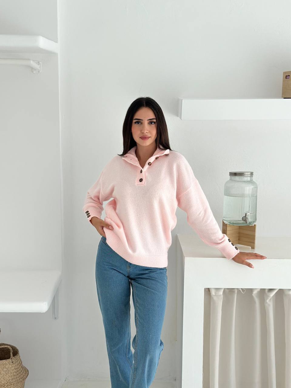 Женский Розовый Джемпер Свободного Кроя с Воротником и Заниженной Линией Плеча