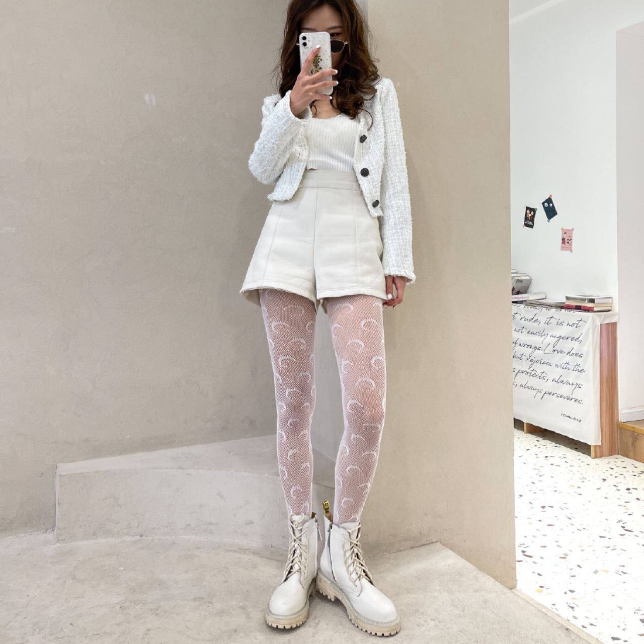 Женские Белые Колготки в Мелкую Сетку с Рисунком Принтом Луна