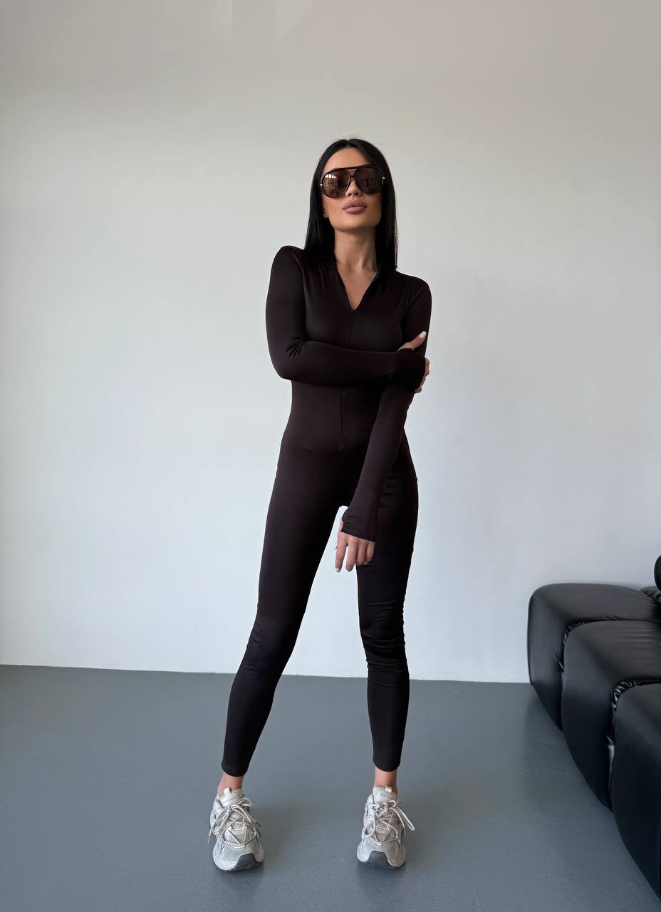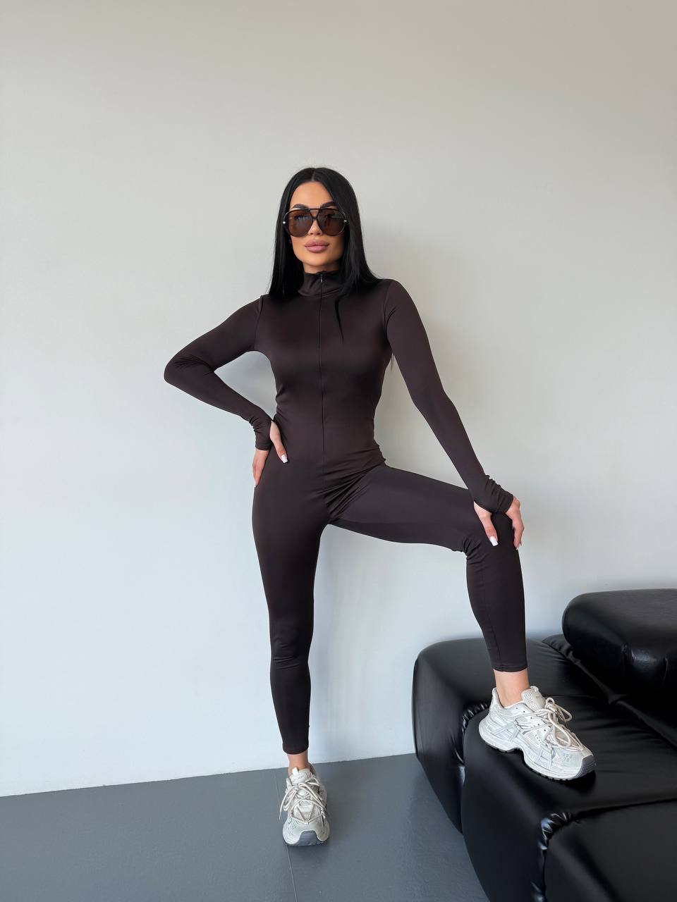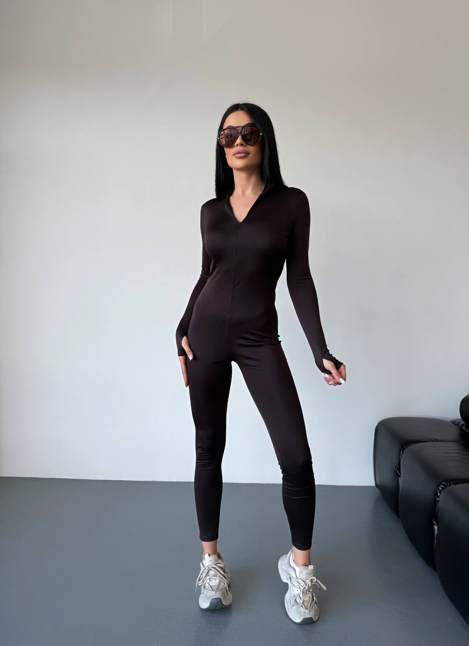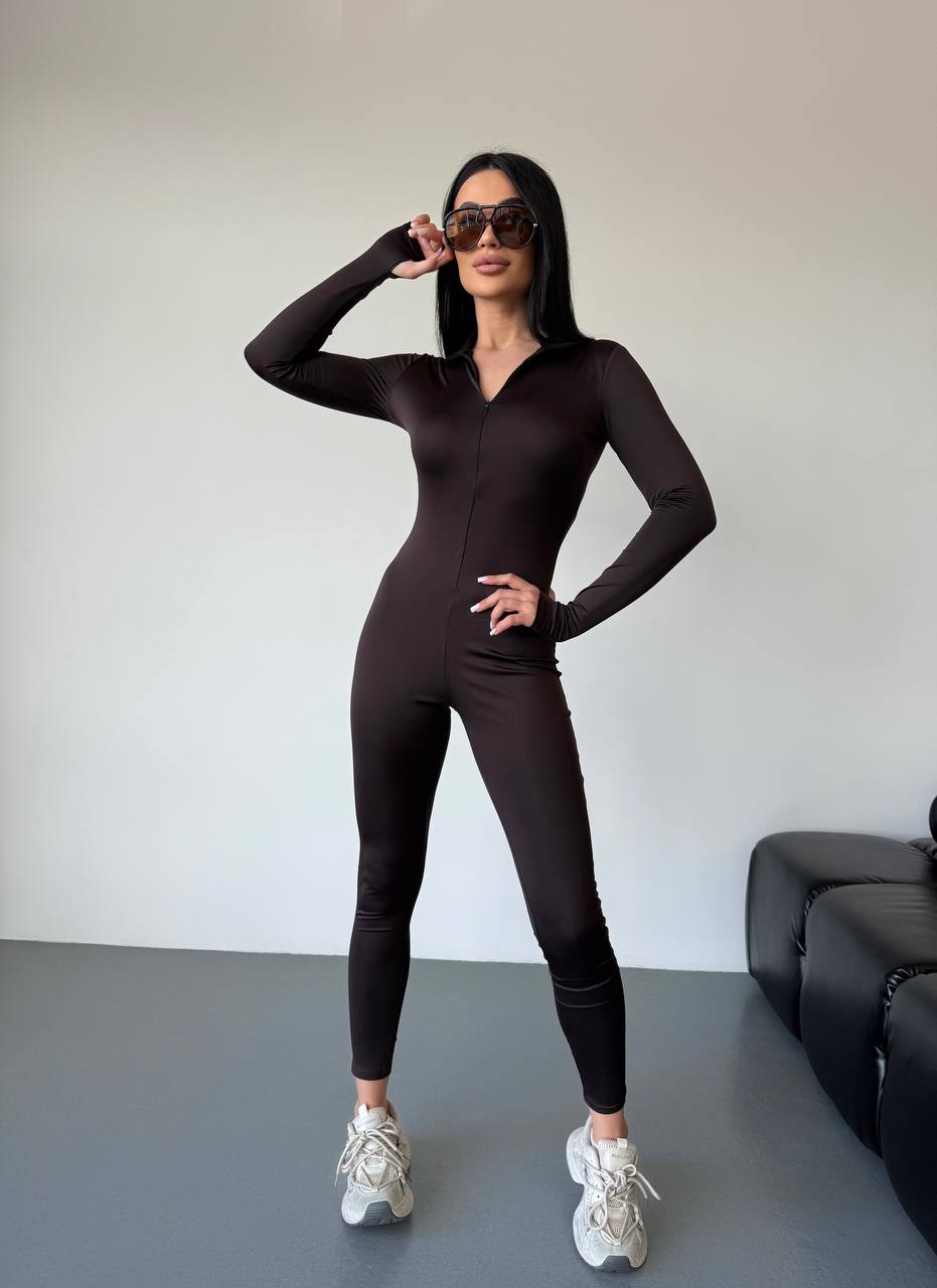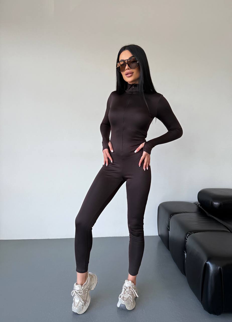 Женский Облегающий Коричневый Комбинезон на Молнии