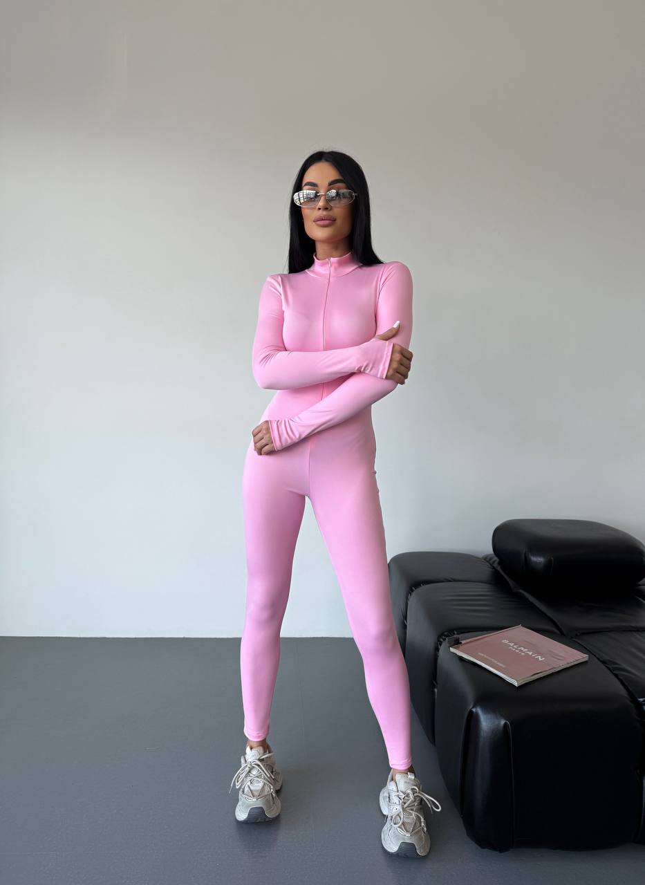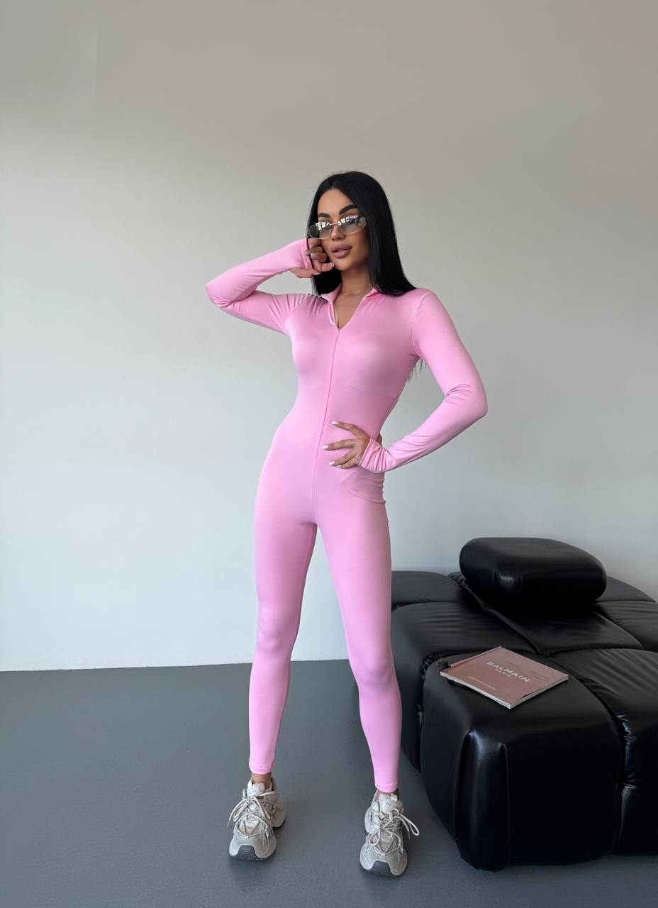 Женский Облегающий Розовый Комбинезон на Молнии