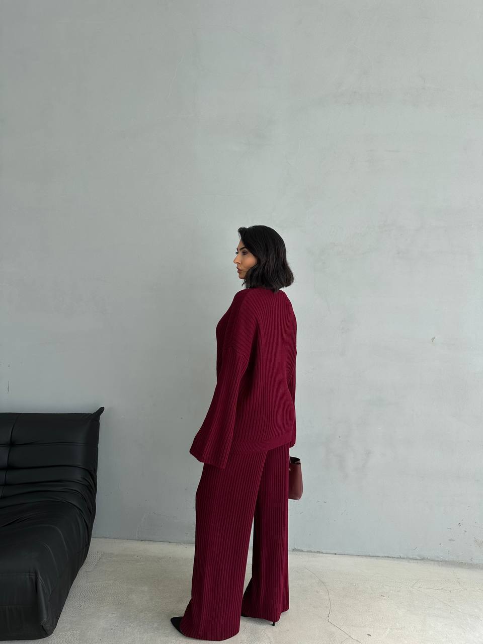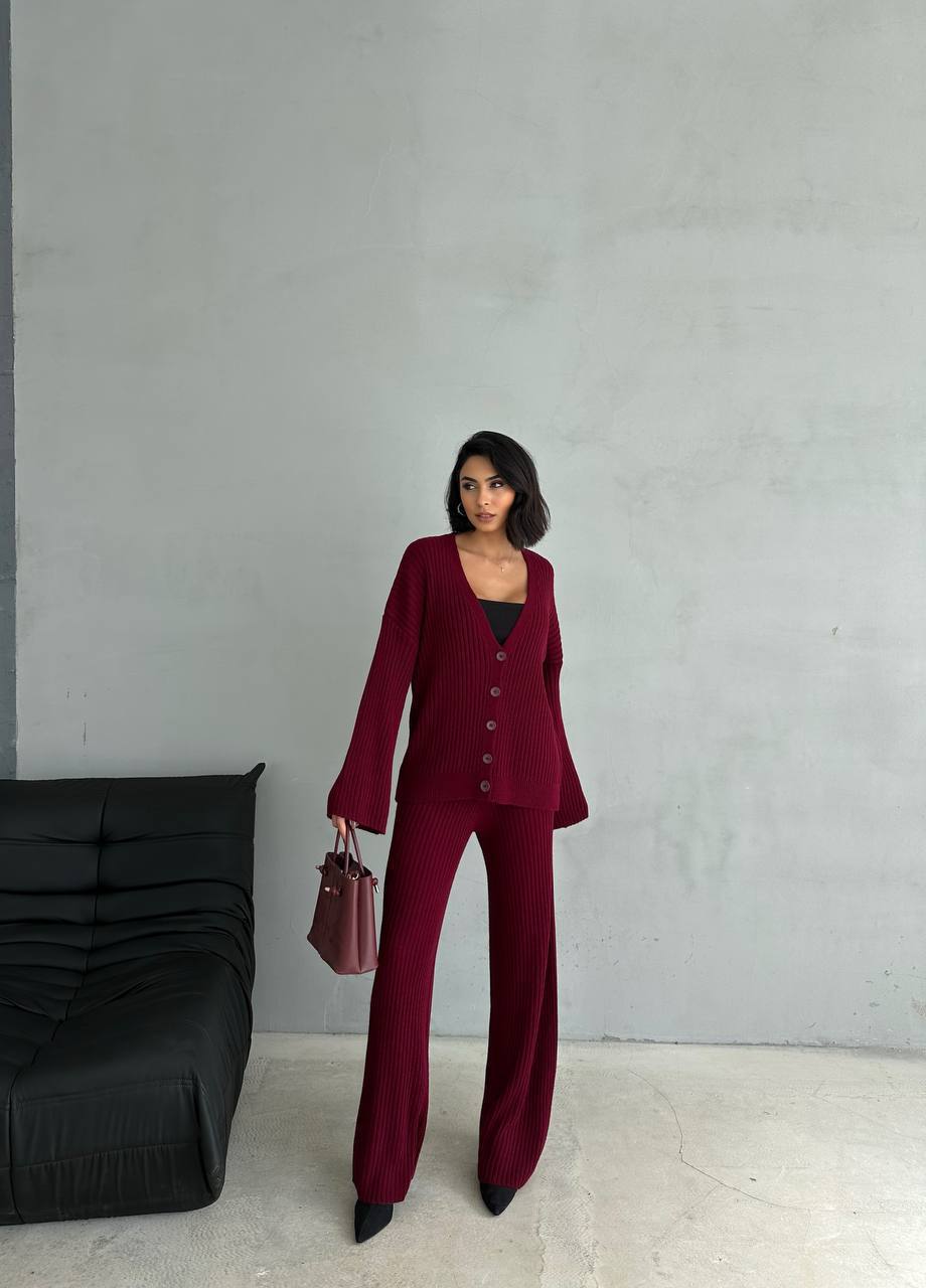 Женский Базовый Бордовый Костюм Свободного Кроя в Широкий Рубчик – Комплект Кардиган Штаны