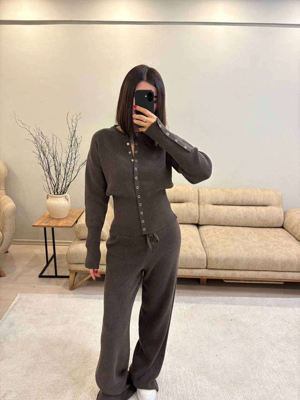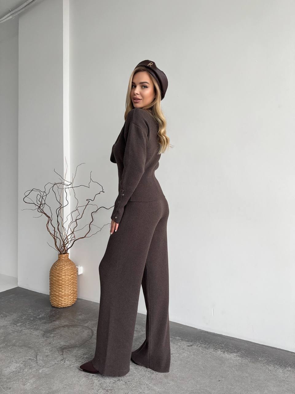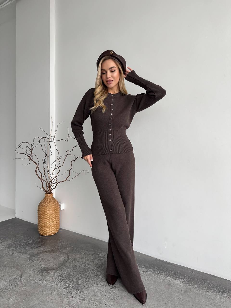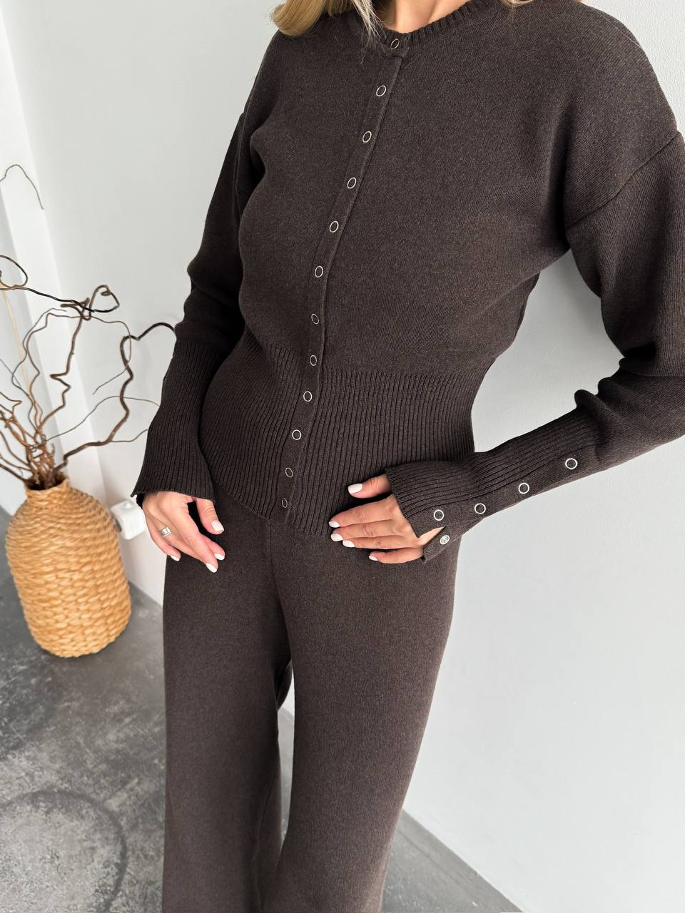 Женский Базовый Коричневый Костюм Трикотажный – Кофта на Кнопках + Штаны Свободного Кроя