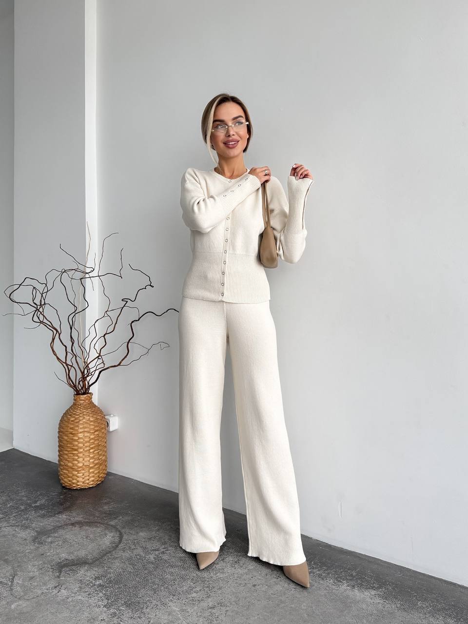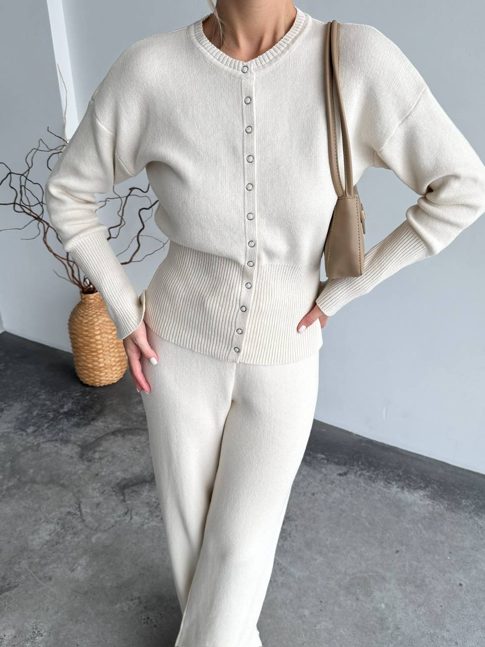 Женский Базовый Молочный Костюм Трикотажный – Кофта на Кнопках + Штаны Свободного Кроя