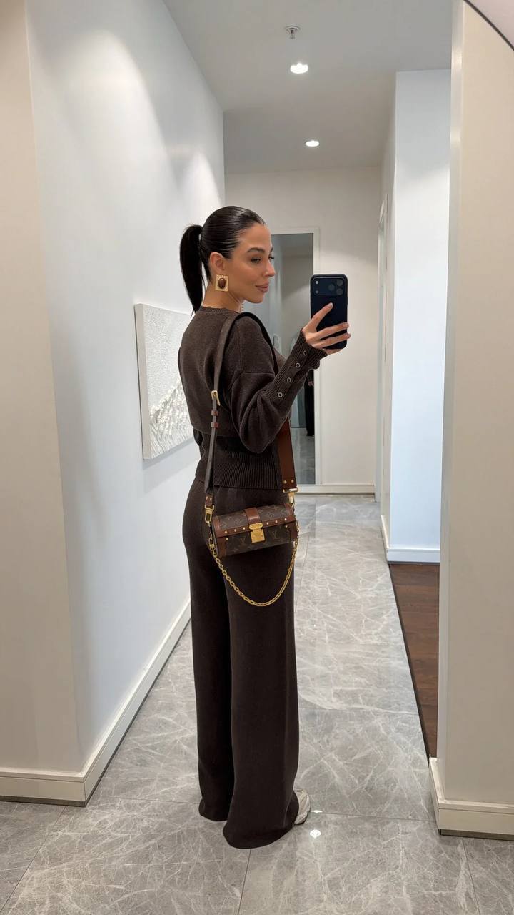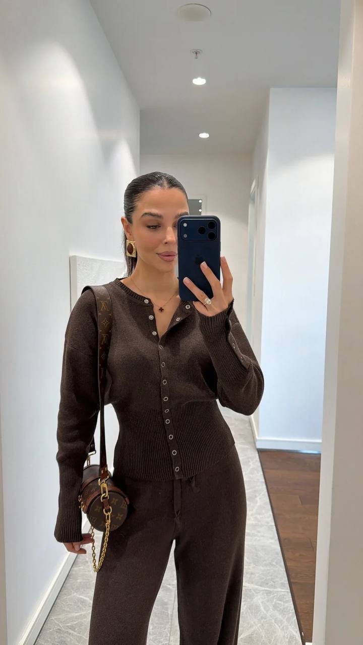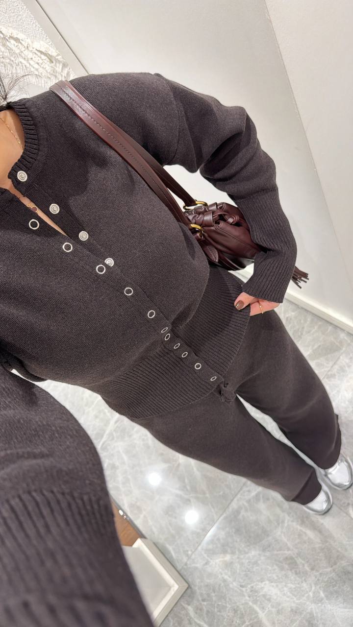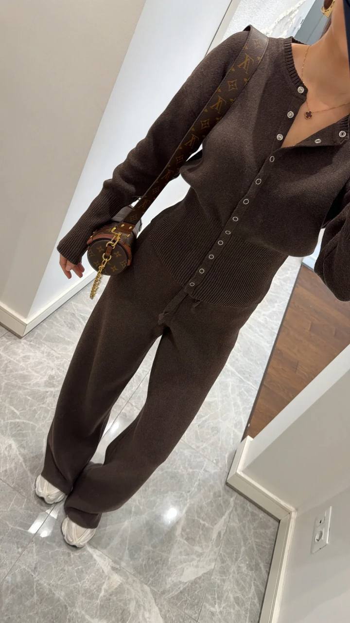 Женский Базовый Повседневный Коричневый Костюм на Кнопках – Кофта Кардиган + Свободные Штаны