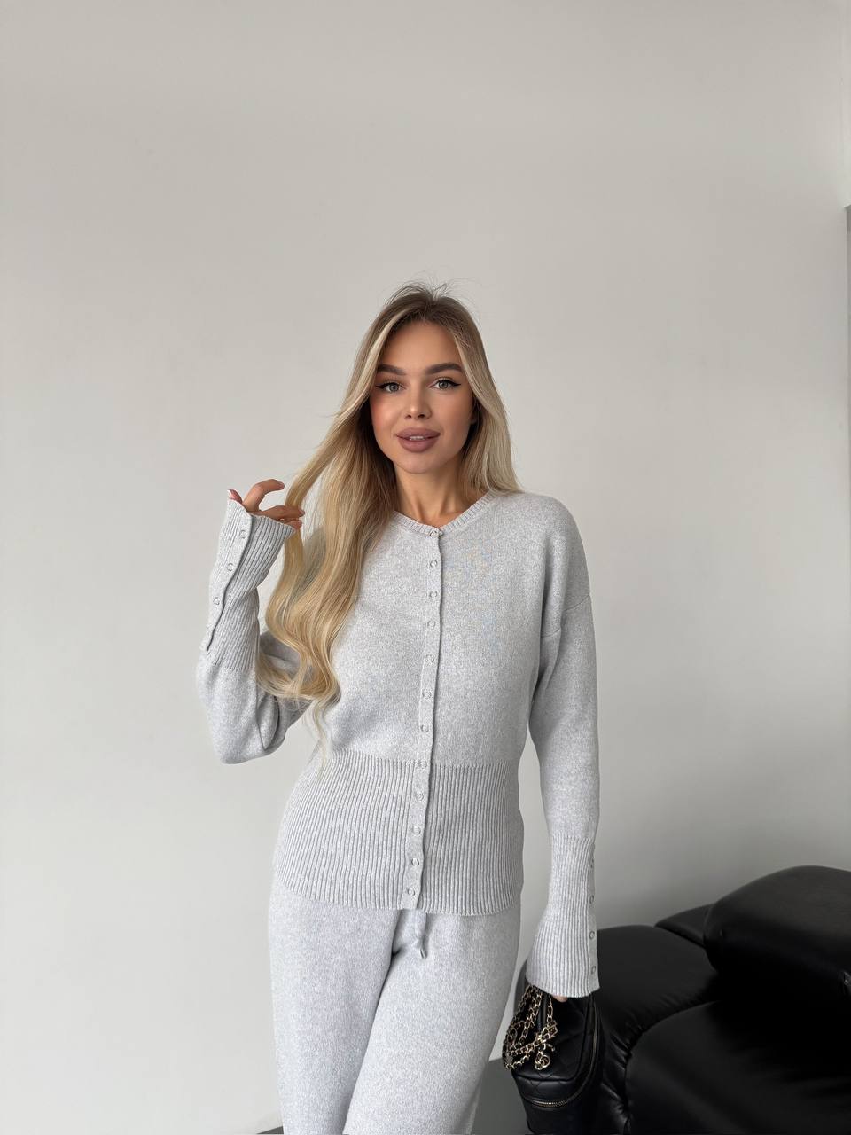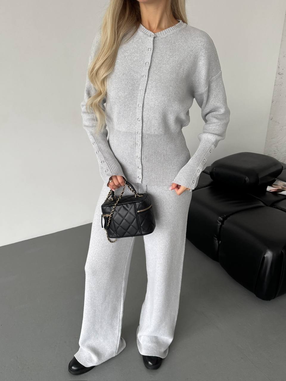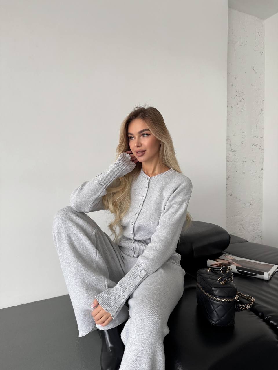 Женский Базовый Серый Костюм Трикотажный – Кофта на Кнопках + Штаны Свободного Кроя