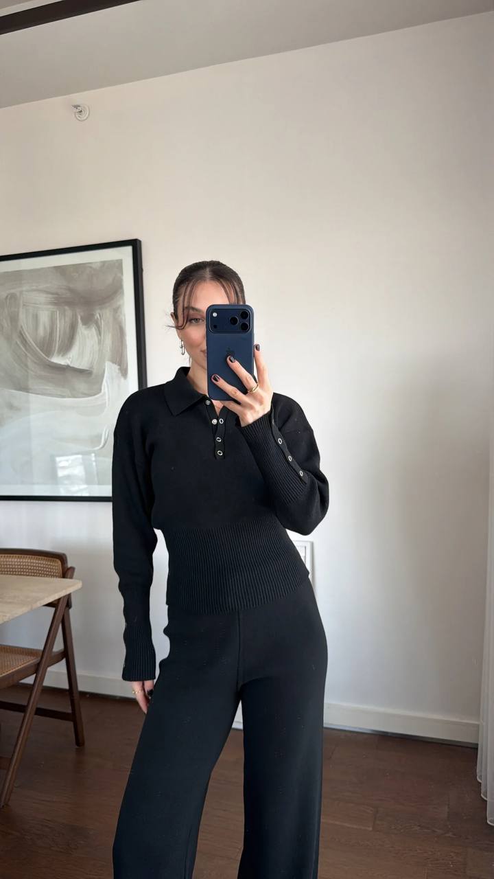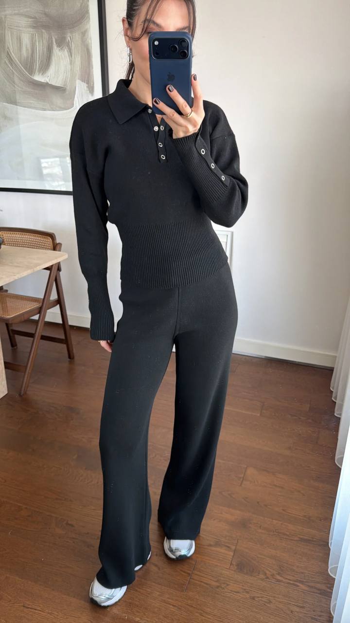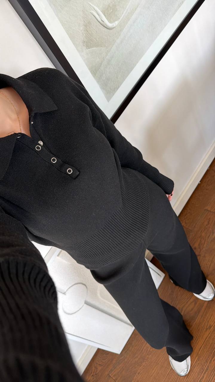 Женский Базовый Трикотажный Черный Костюм – Кофта Поло + Свободные Штаны