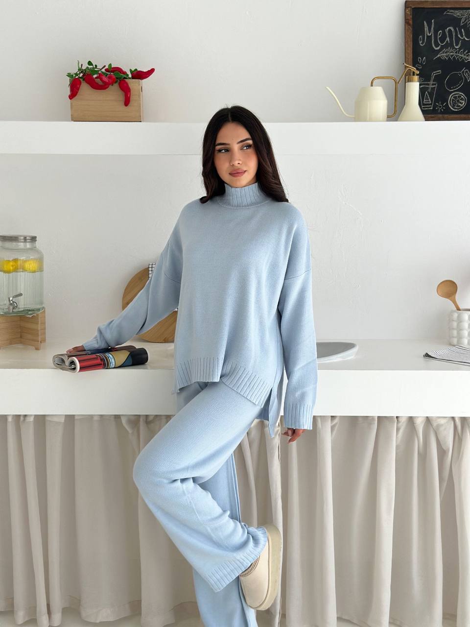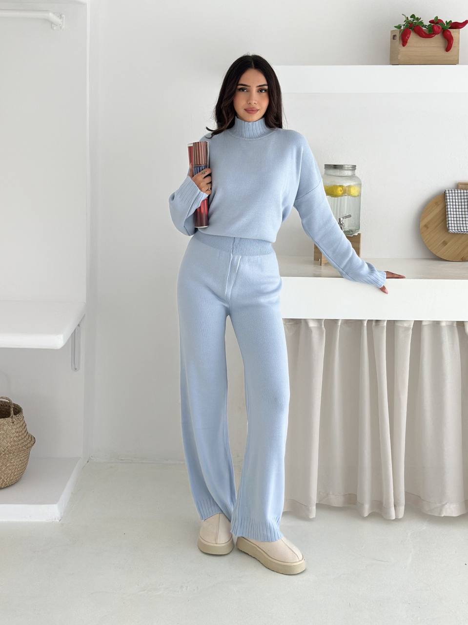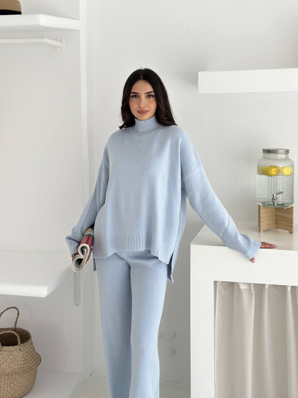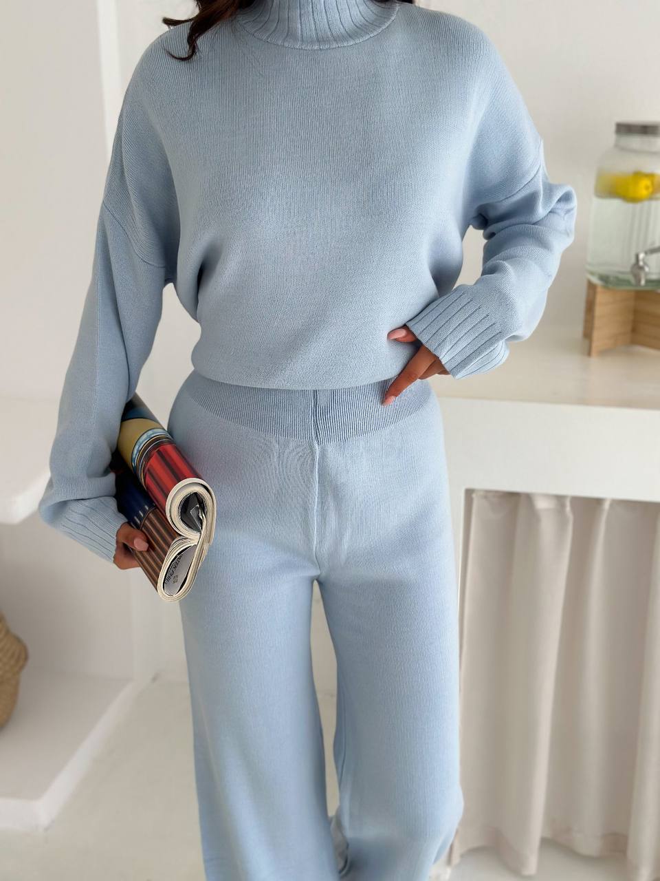 Женский Базовый Трикотажный Голубой Костюм Свободного Кроя – Свитер под Горло + Широкие Штаны