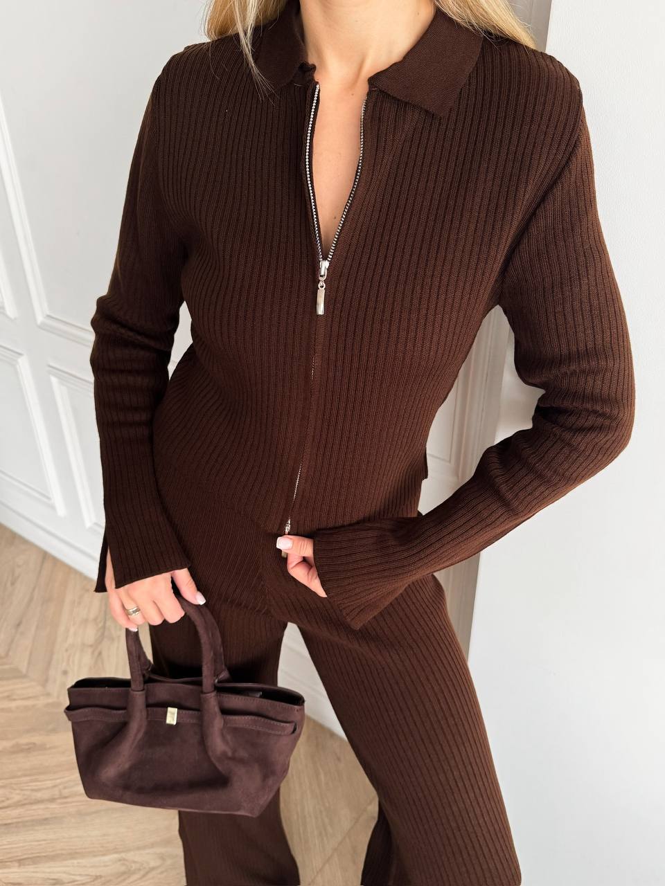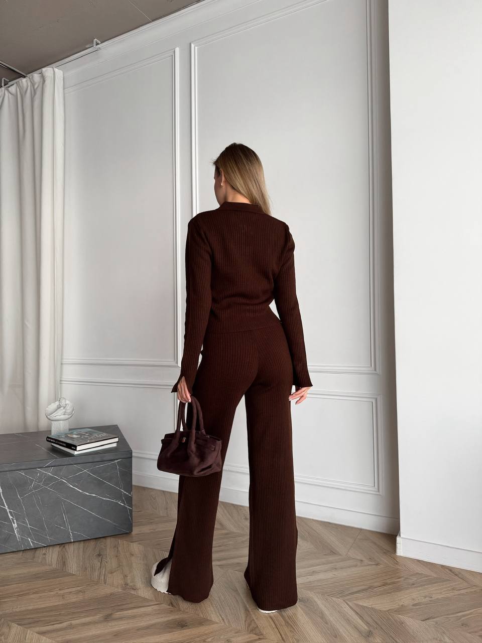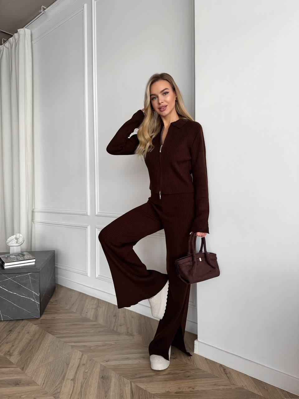 Женский Базовый Трикотажный Коричневый Костюм в Рубчик с Разрезами – Кофта Поло на Молнии + Штаны Прямого Кроя