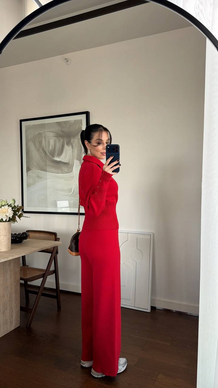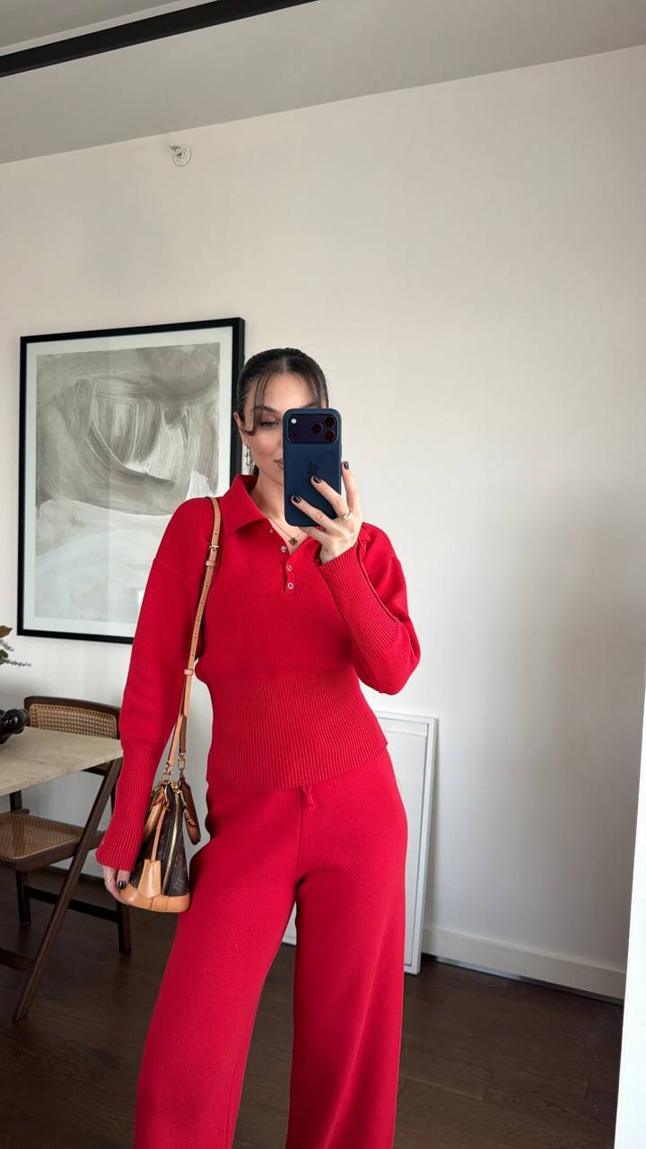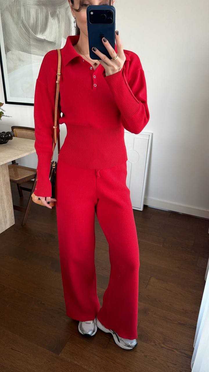 Женский Базовый Трикотажный Красный Костюм – Кофта Поло + Свободные Штаны