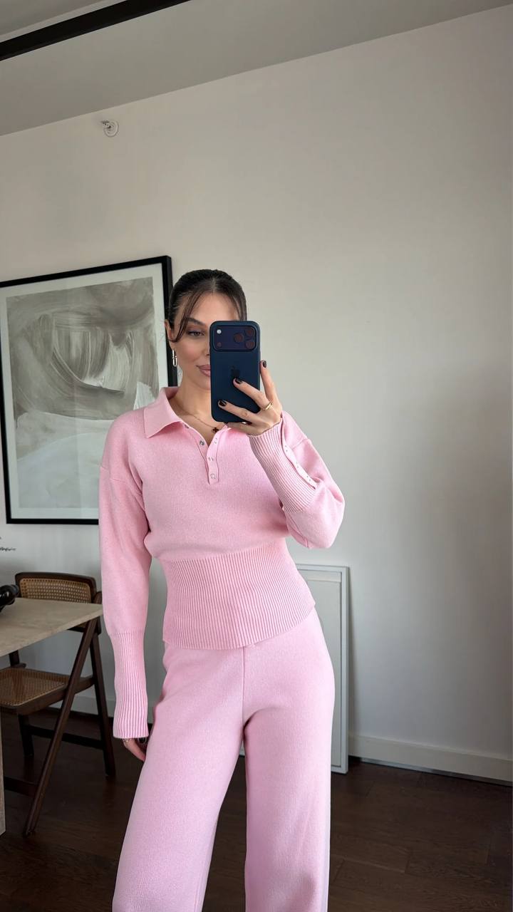 Женский Базовый Трикотажный Розовый Костюм – Кофта Поло + Свободные Штаны