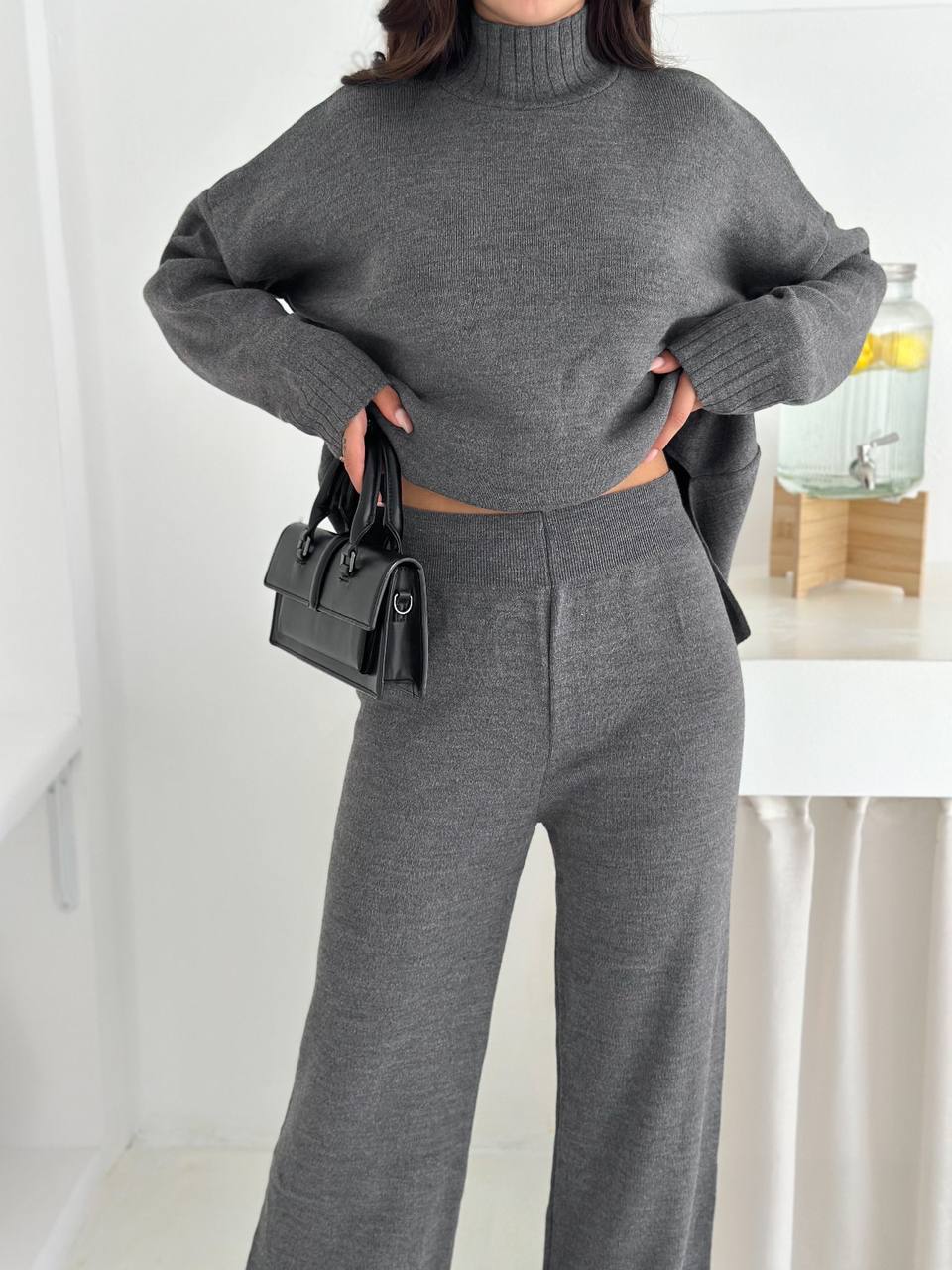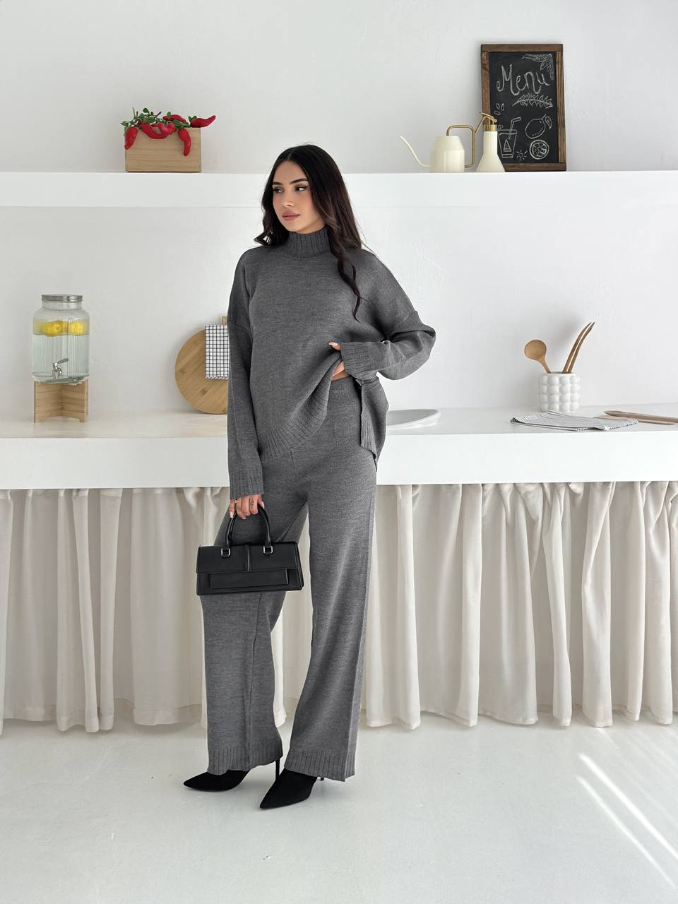 Женский Базовый Трикотажный Серый Костюм Свободного Кроя – Свитер под Горло + Широкие Штаны