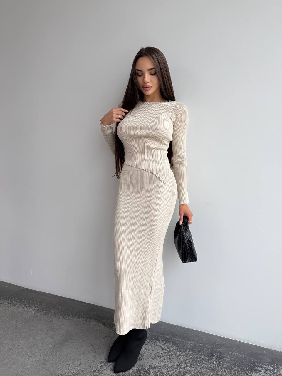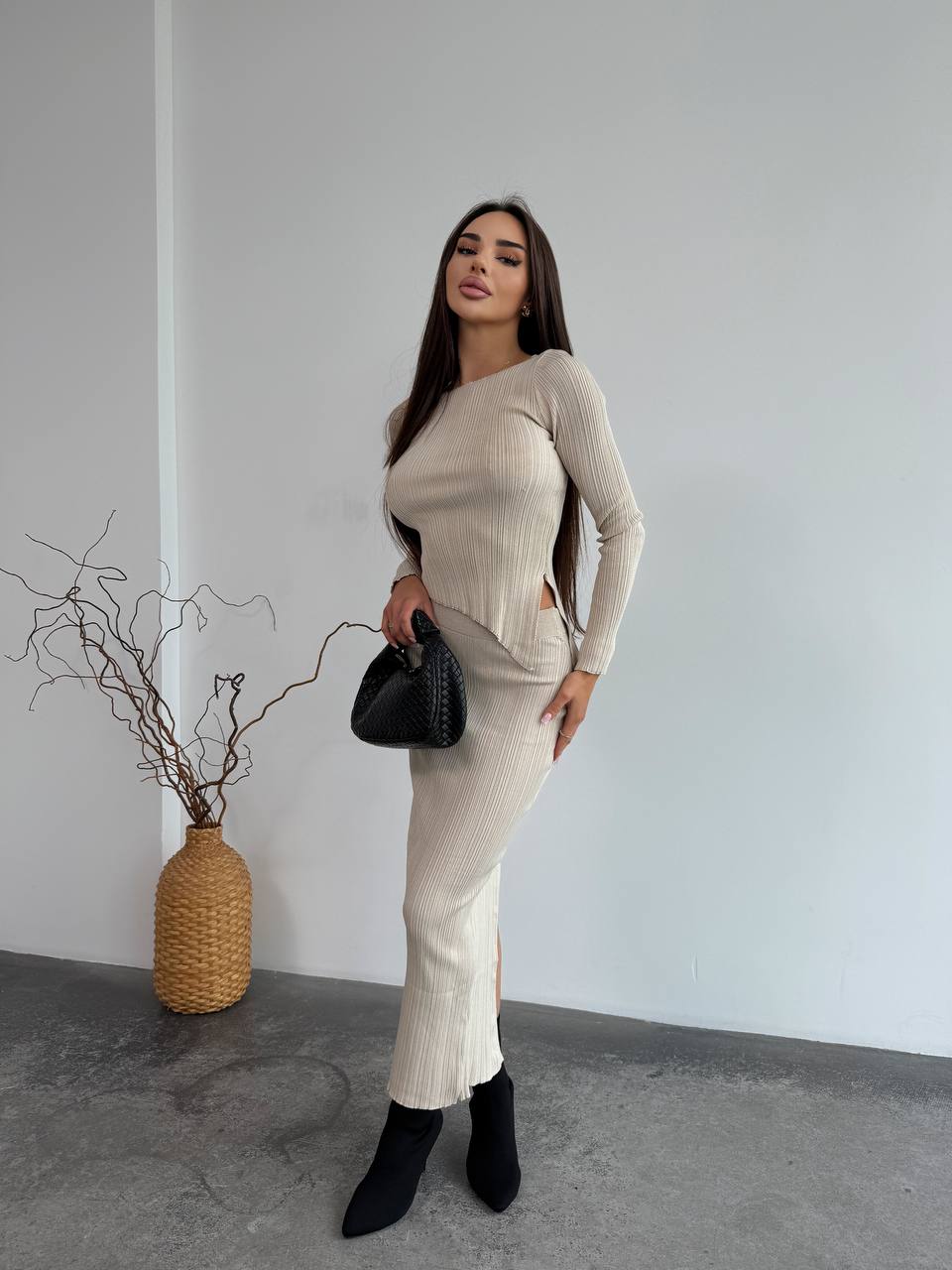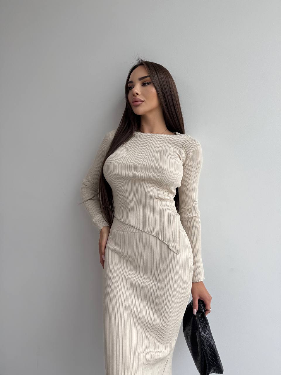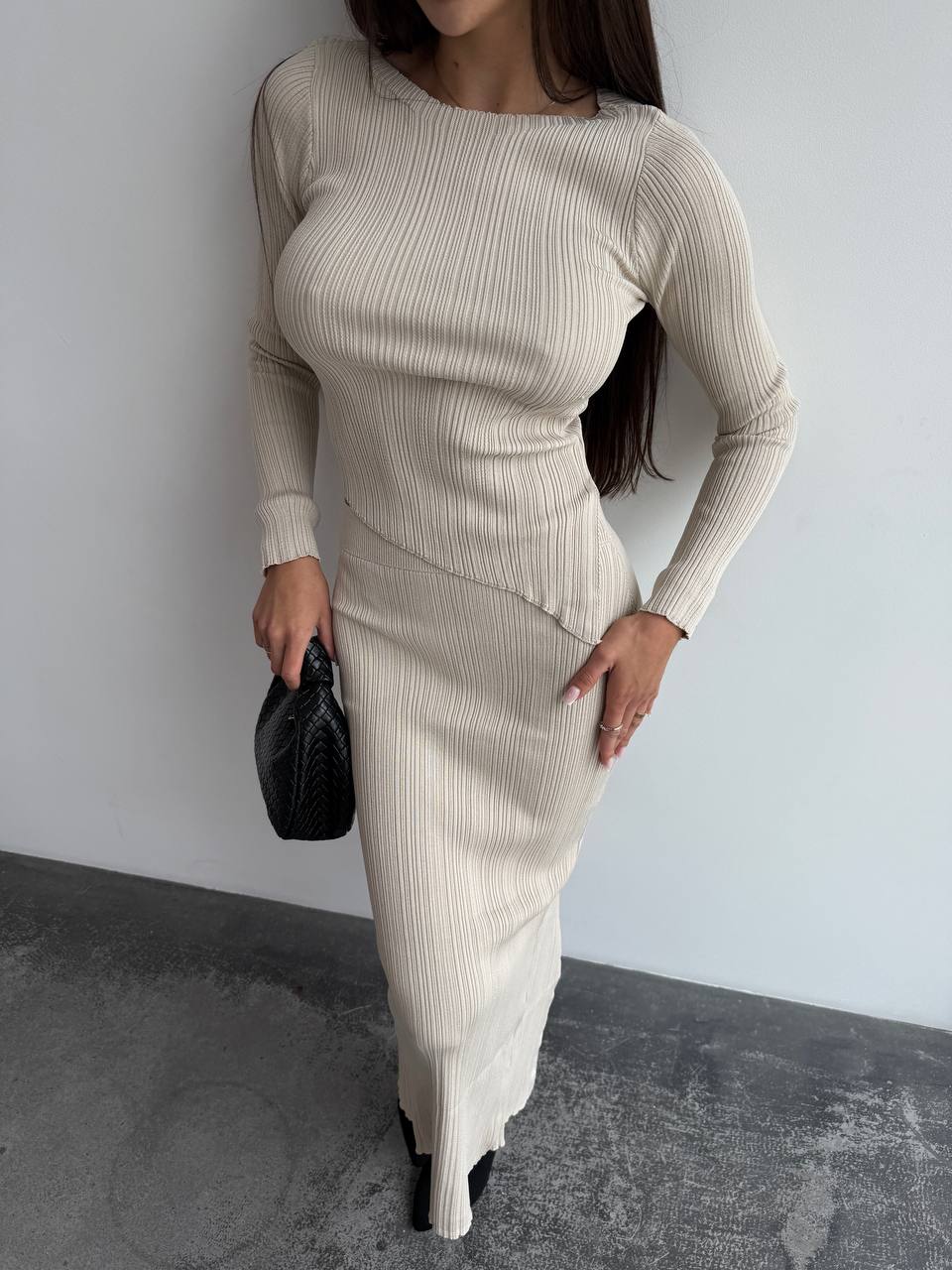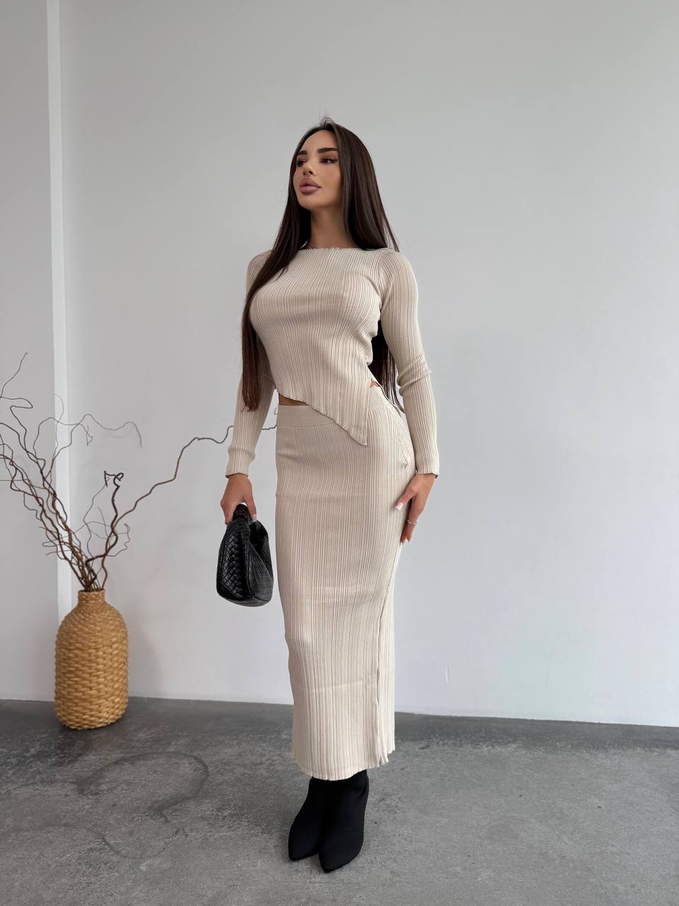 Женский Бежевый Комплект Двойка – Асимметричный Топ с Длинными Рукавами + Юбка Макси с Разрезом Сзади