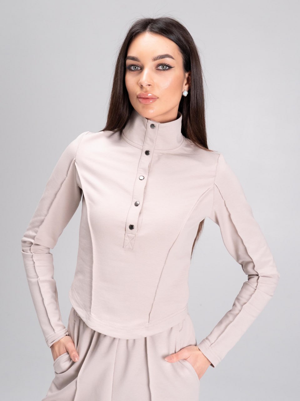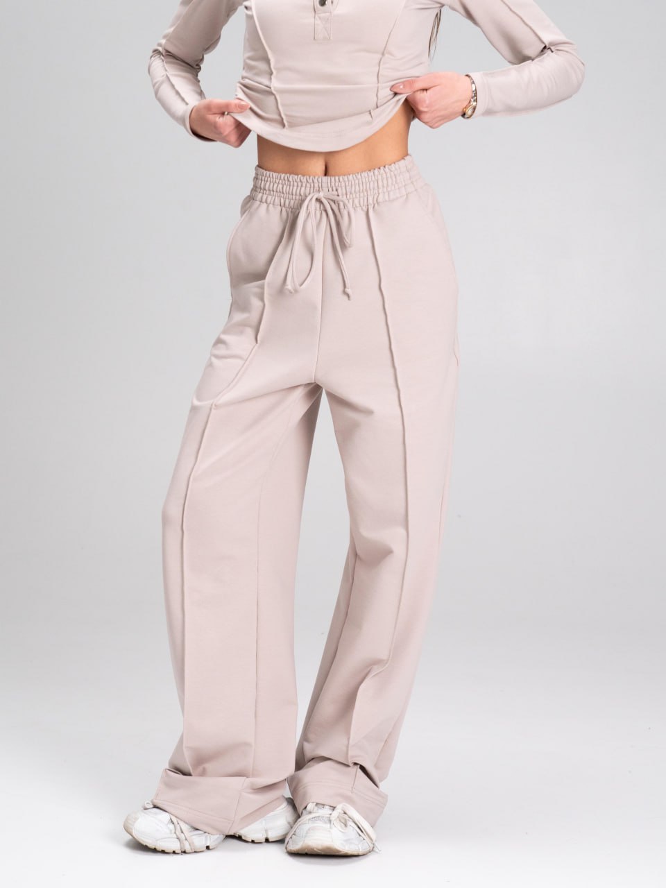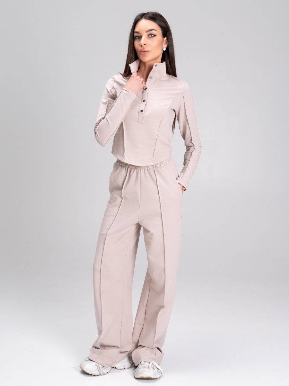 Женский Бежевый Костюм Двойка – Приталенная Кофта + Широкие Штаны