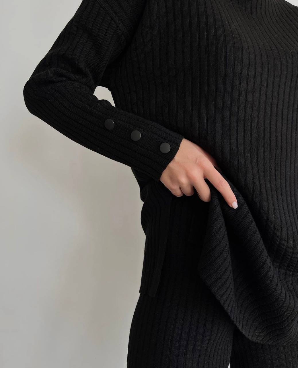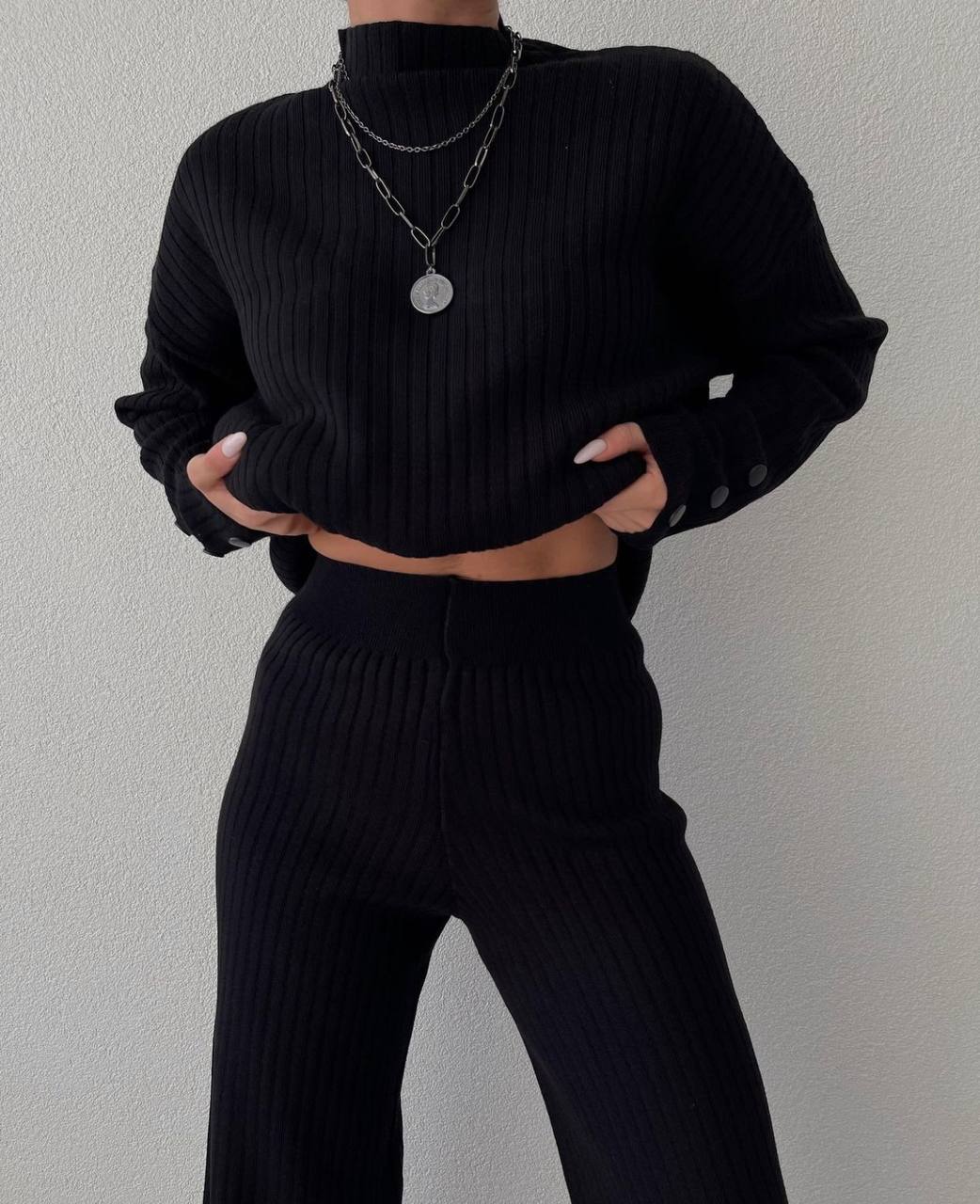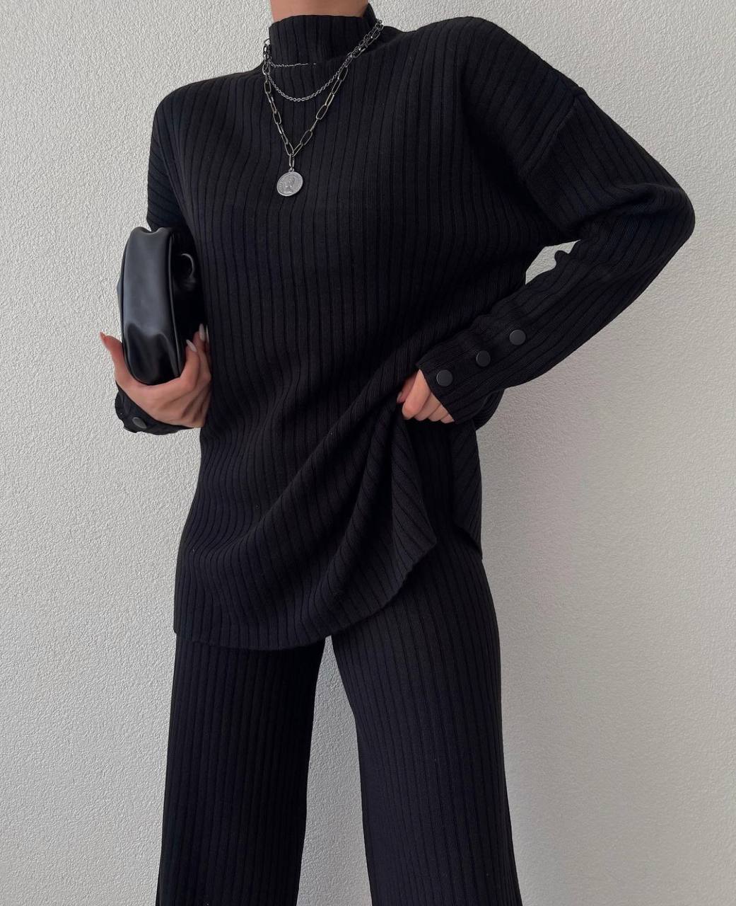 Женский Черный Костюм Двойка в Рубчик Свободного Кроя – Удлиненная Кофта + Штаны