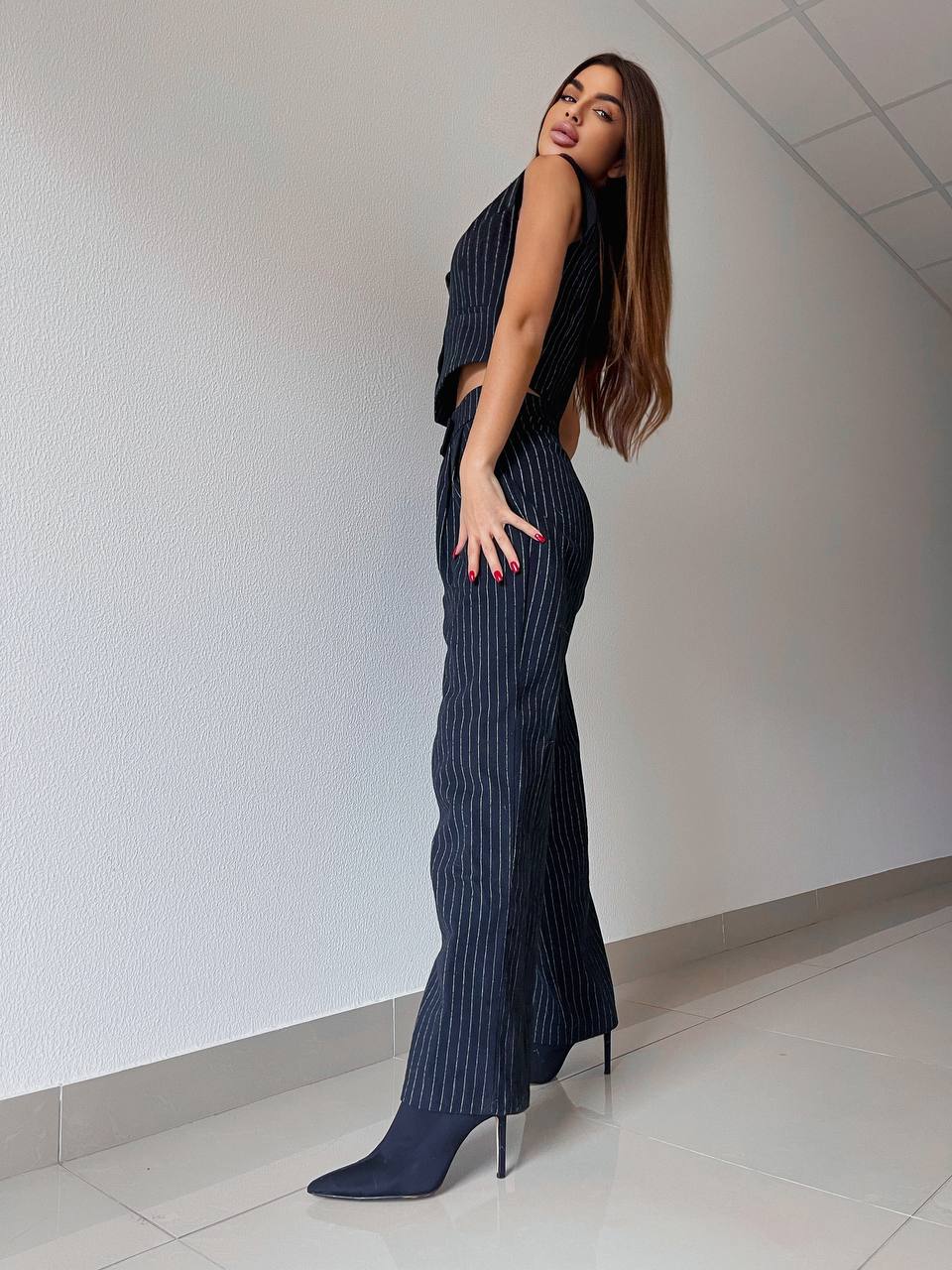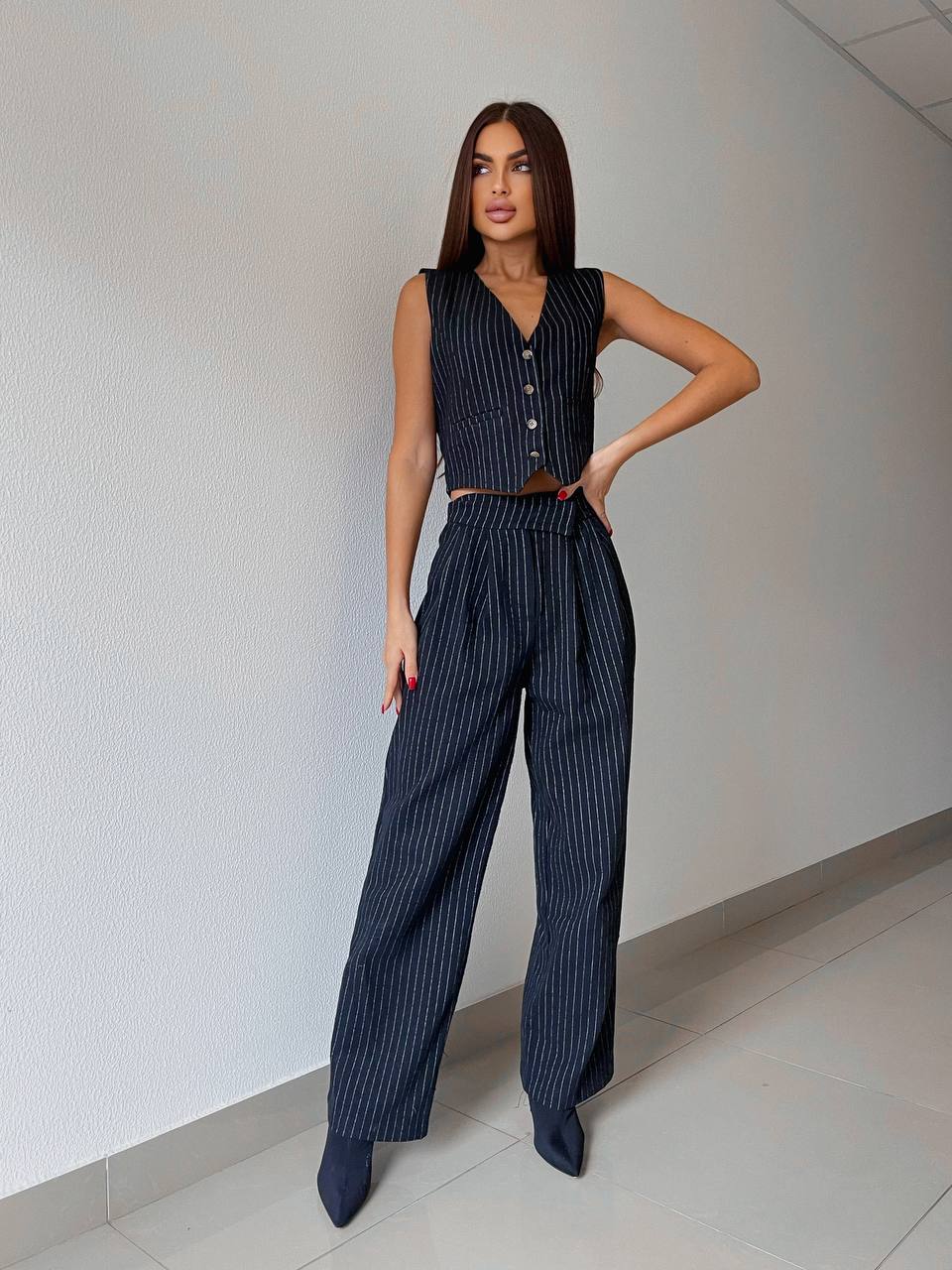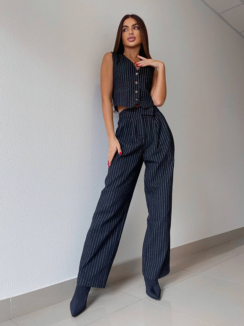 Женский Черный Костюм Комплект в Полоску – Жилет на Пуговицах + Брюки