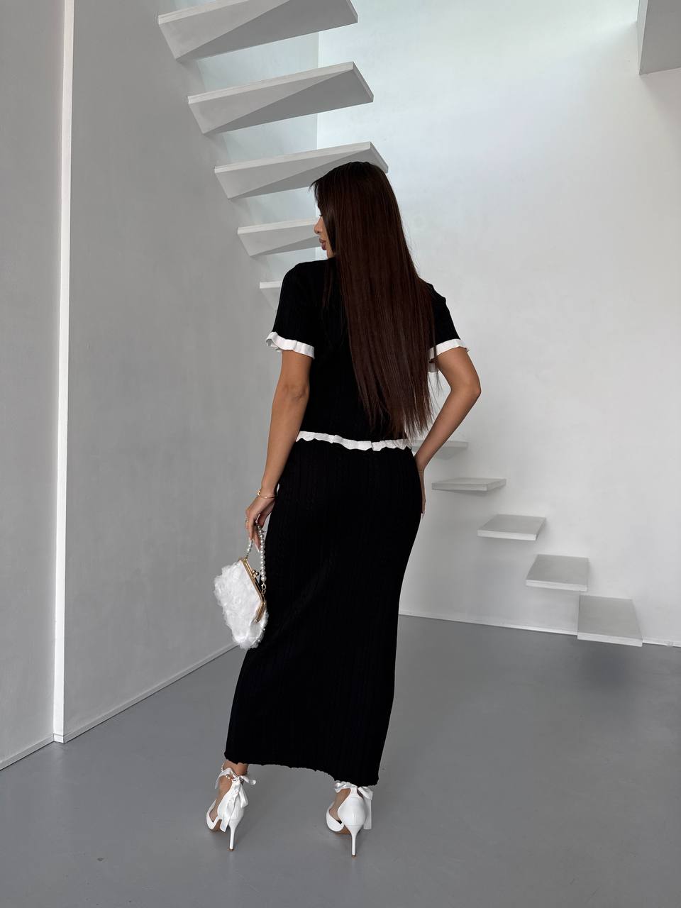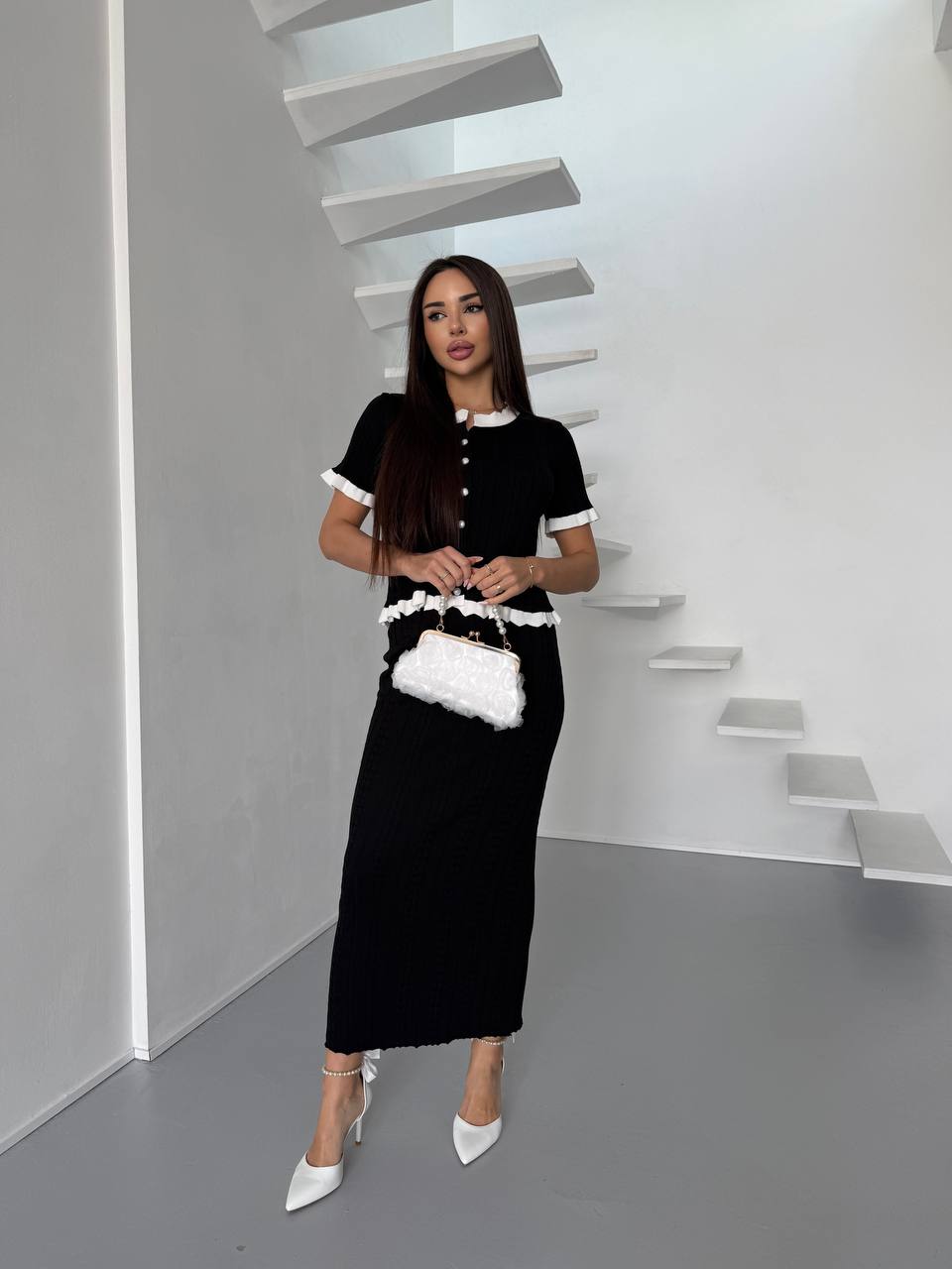 Женский Элегантный Черный Костюм Двойка с Белыми Рюшами – Жакет на Пуговицах + Длинная Юбка