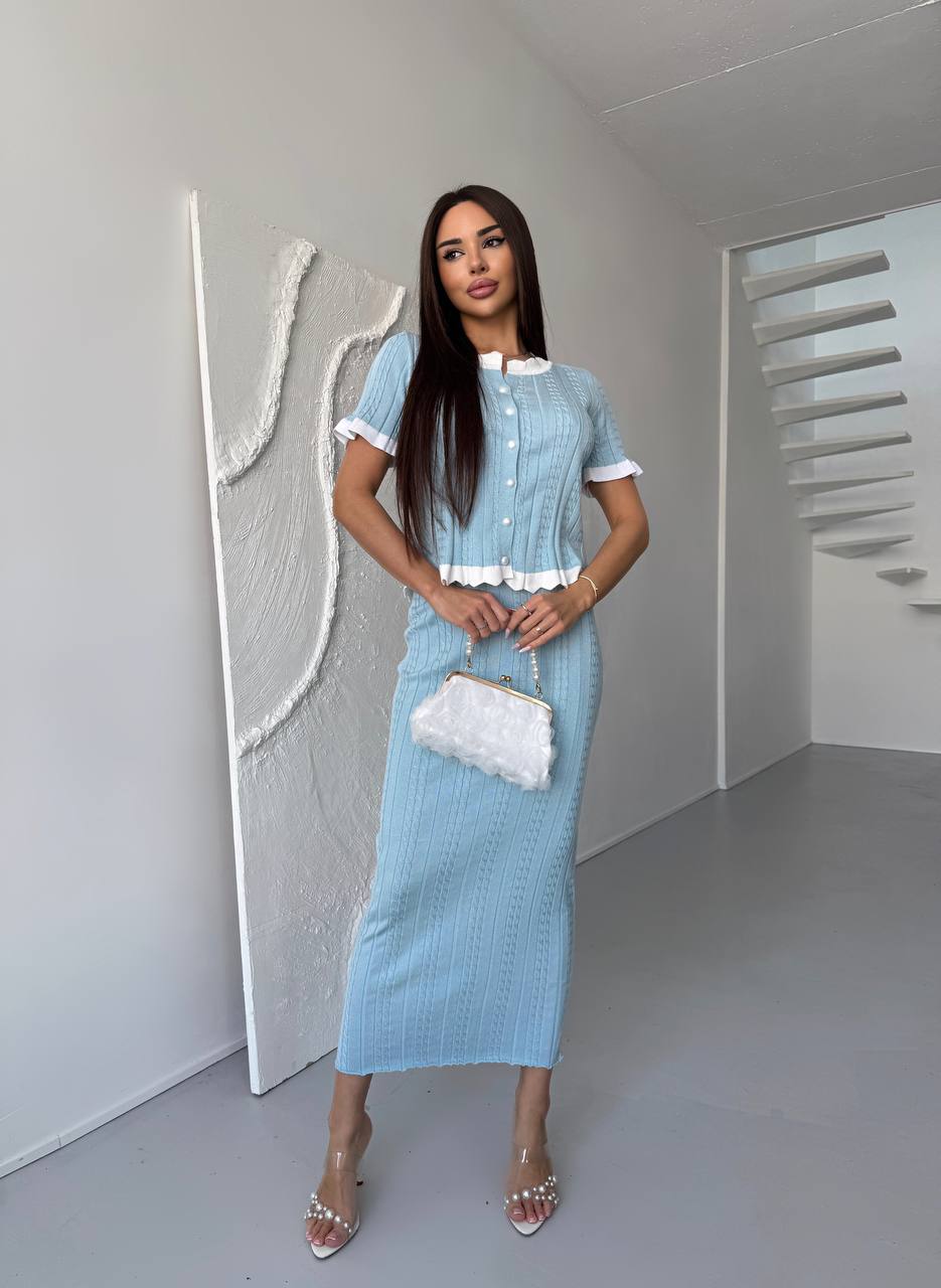 Женский Элегантный Голубой Костюм Двойка с Белыми Рюшами – Жакет на Пуговицах + Длинная Юбка