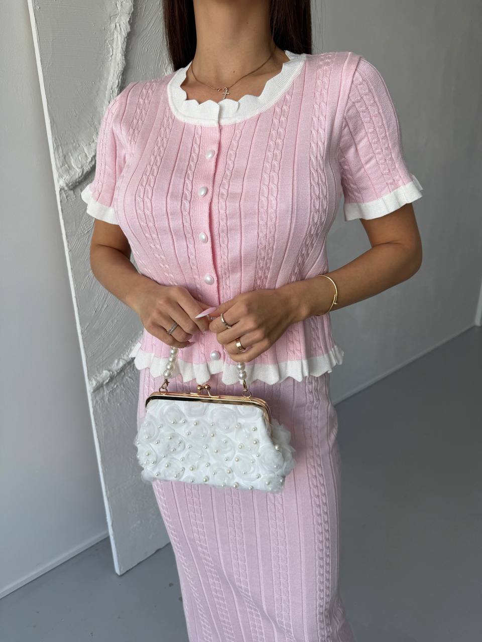 Женский Элегантный Розовый Костюм Двойка с Белыми Рюшами – Жакет на Пуговицах + Длинная Юбка
