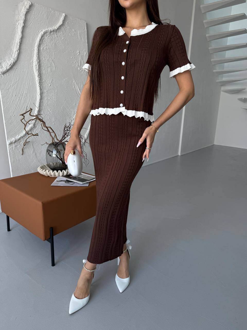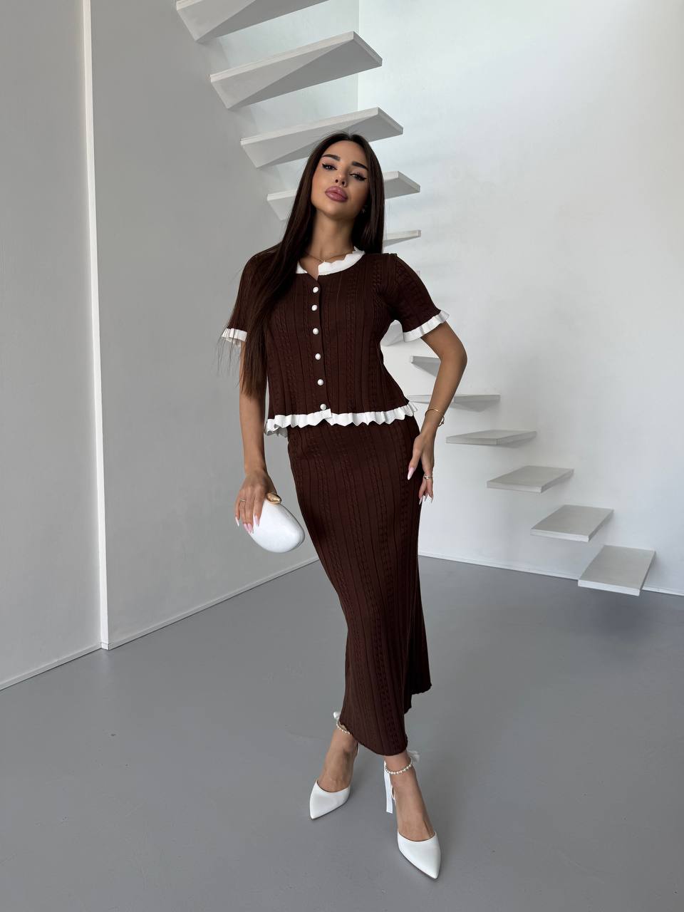 Женский Элегантный Шоколадный Костюм Двойка с Белыми Рюшами – Жакет на Пуговицах + Длинная Юбка