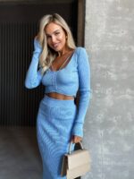 Женский Голубой Костюм в Рубчик – Топ с Длинными Рукавами + Юбка Миди
