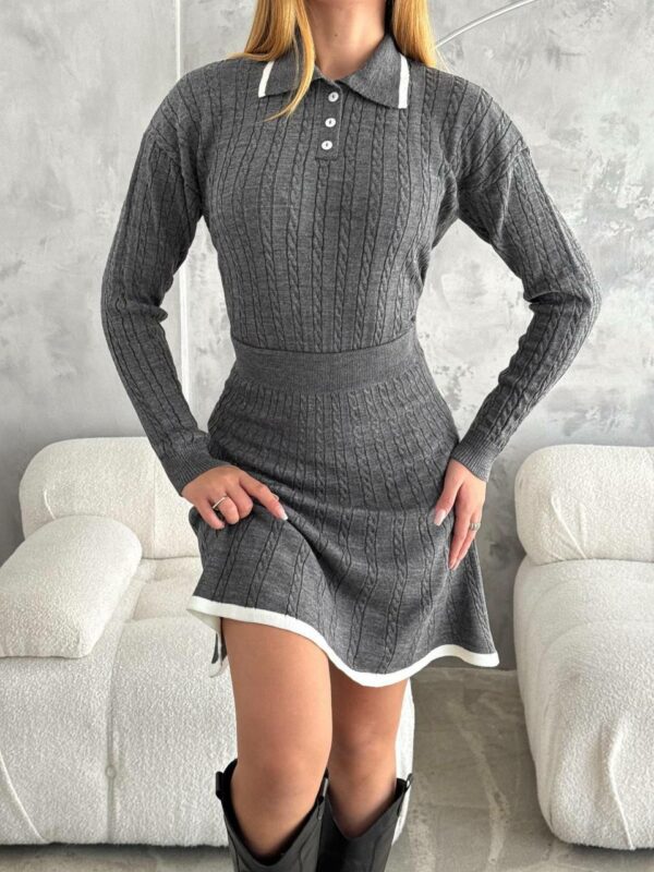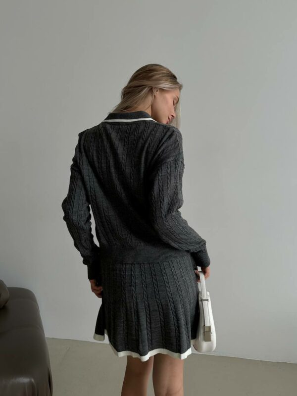 Женский Графитовый Костюм из Фактурной Ткани с Окантовкой – Кофта Поло + Юбка Мини