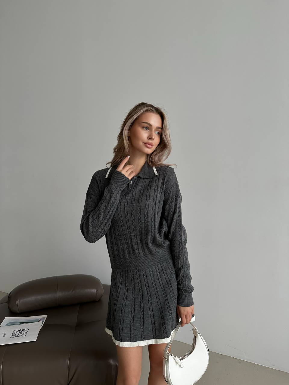 Главная Магазин Каталог Женское Костюмы Casual Женский Графитовый Костюм из Фактурной Ткани с Окантовкой – Кофта Поло + Юбка Мини