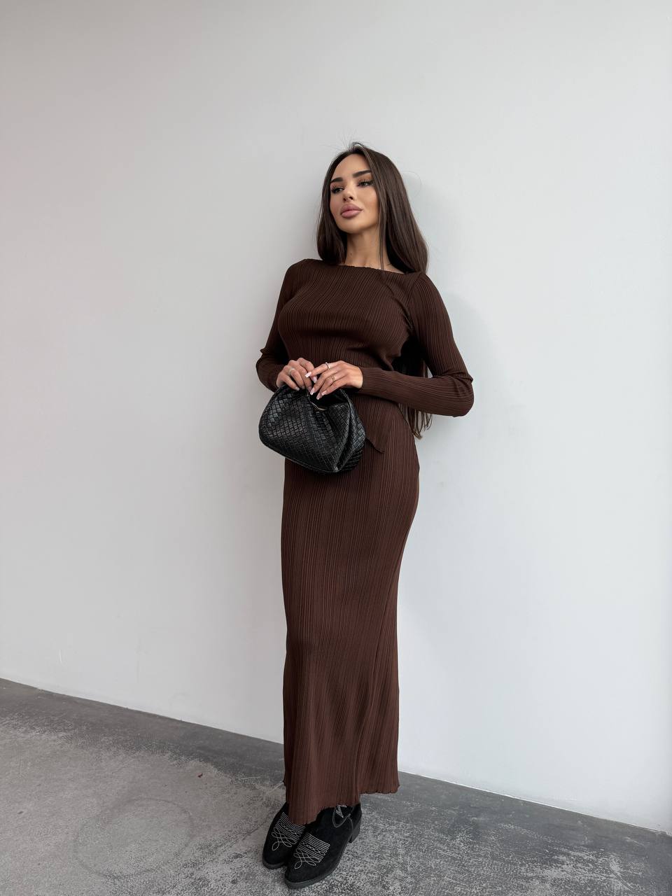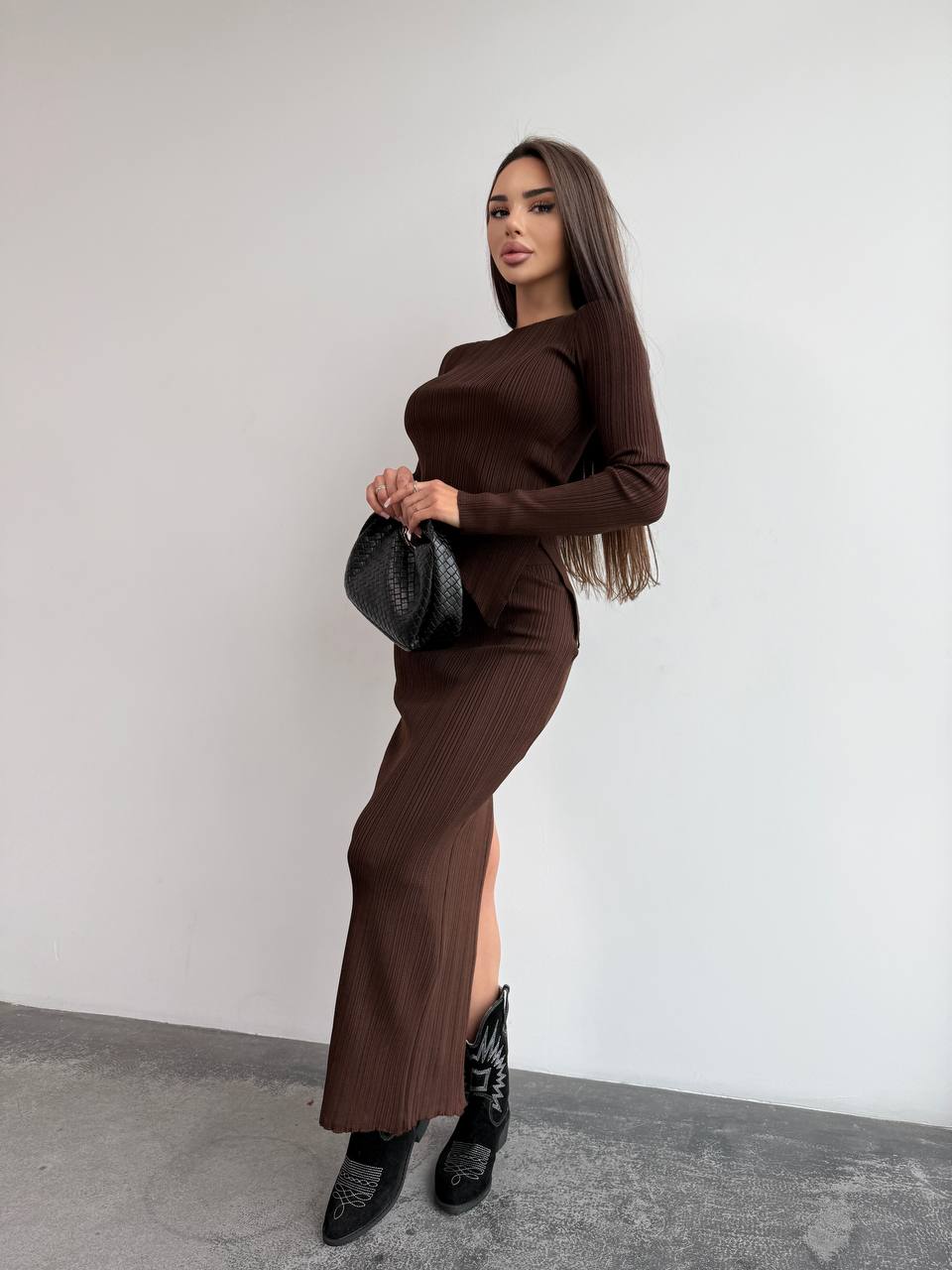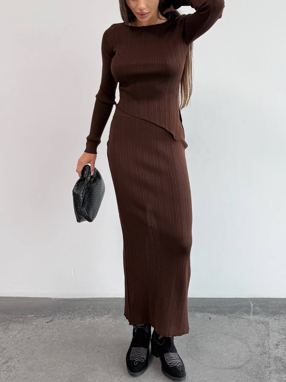 Женский Коричневый Комплект Двойка – Асимметричный Топ с Длинными Рукавами + Юбка Макси с Разрезом Сзади