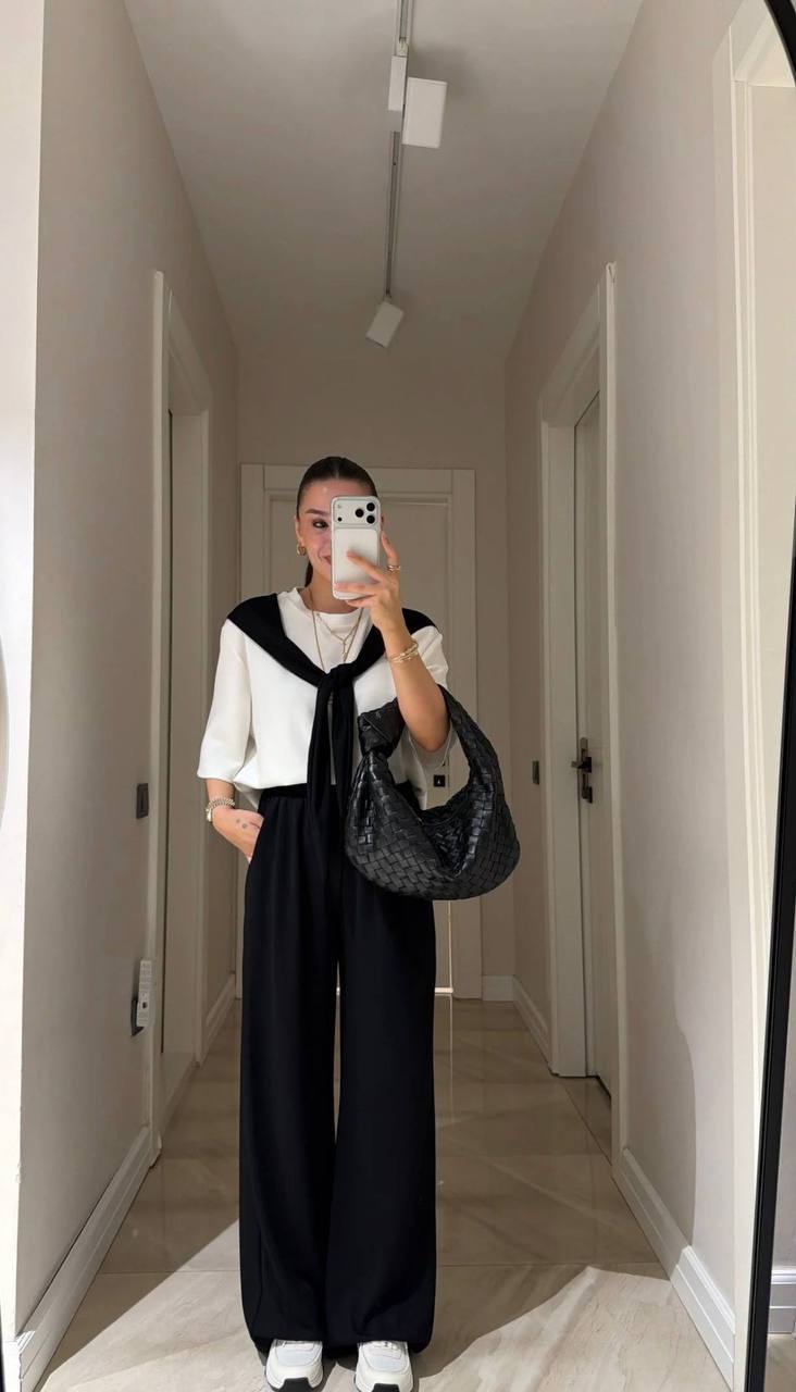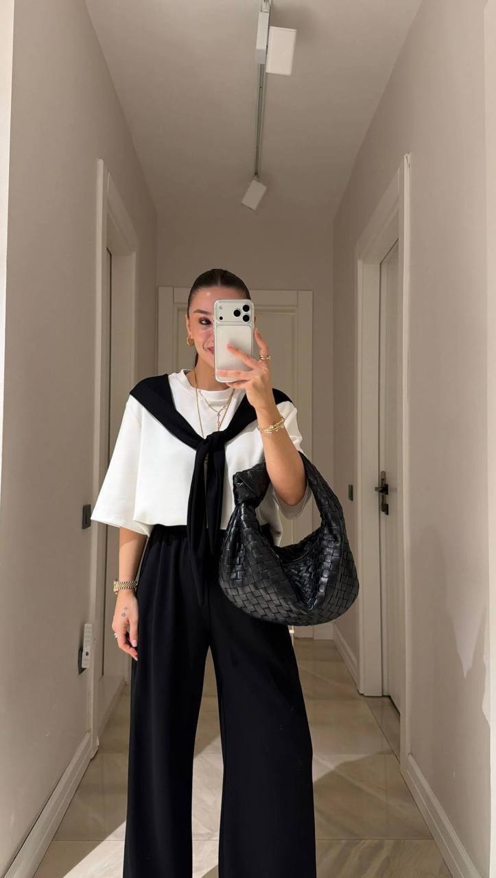 Женский Костюм Комплект Двойка – Белая Футболка с Имитацией Кофты на Плечах + Черные Широкие Штаны