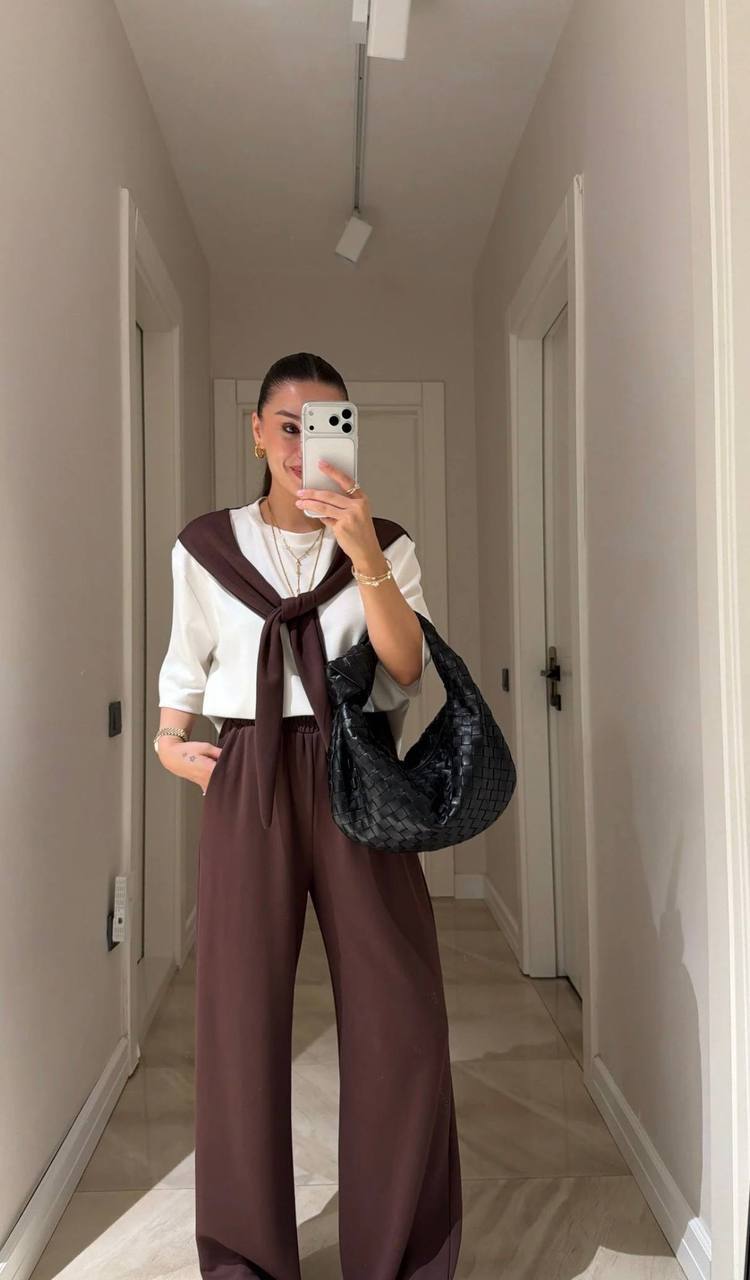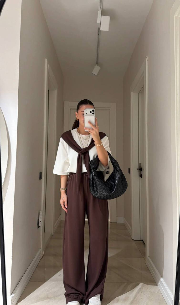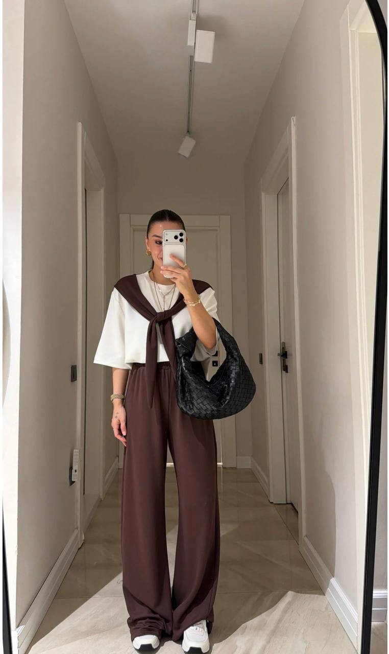 Женский Костюм Комплект Двойка – Белая Футболка с Имитацией Кофты на Плечах + Коричневые Широкие Штаны
