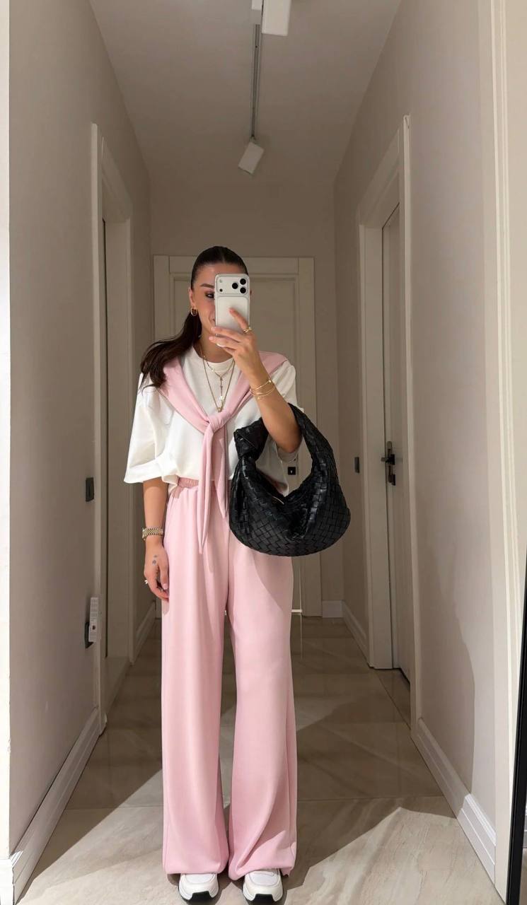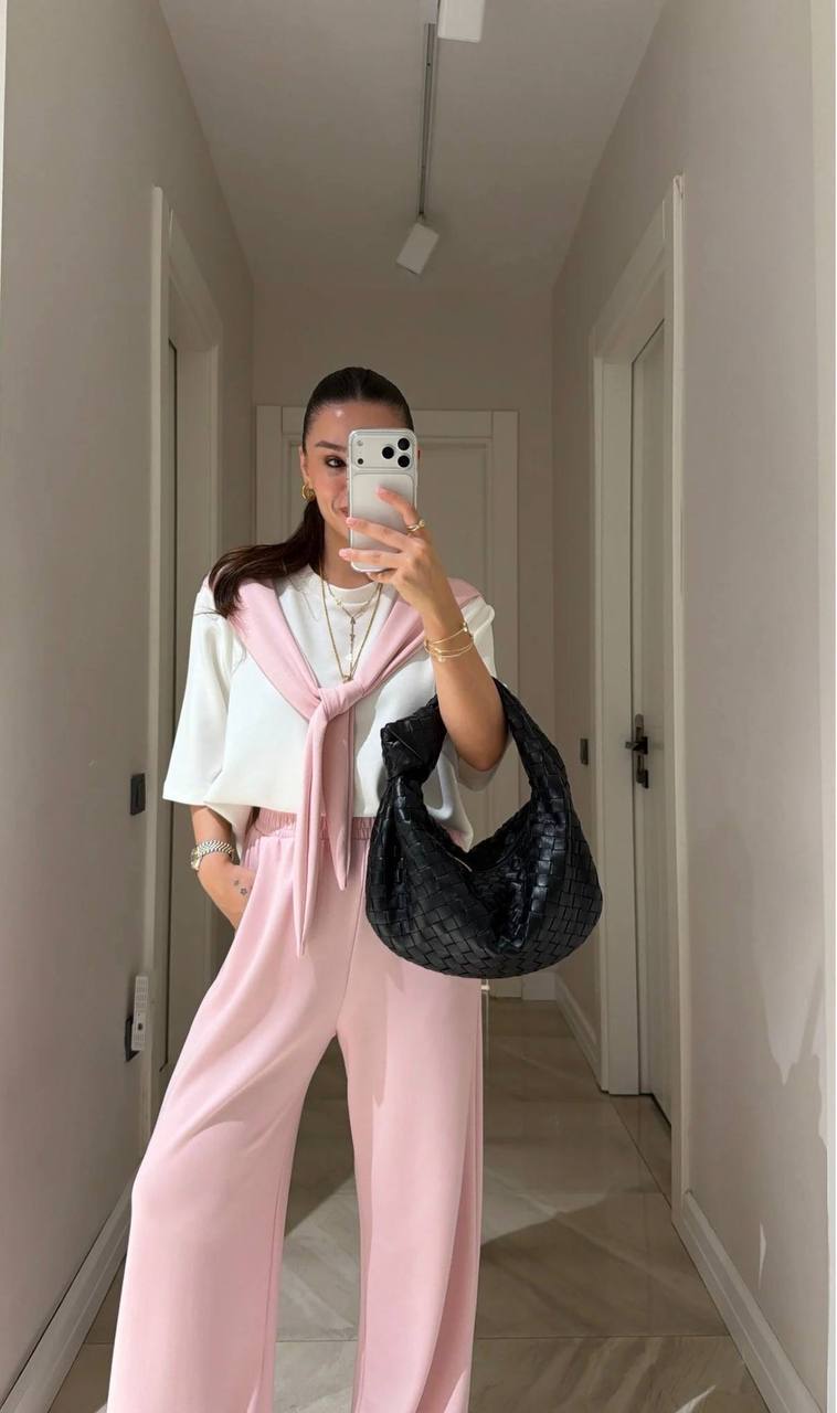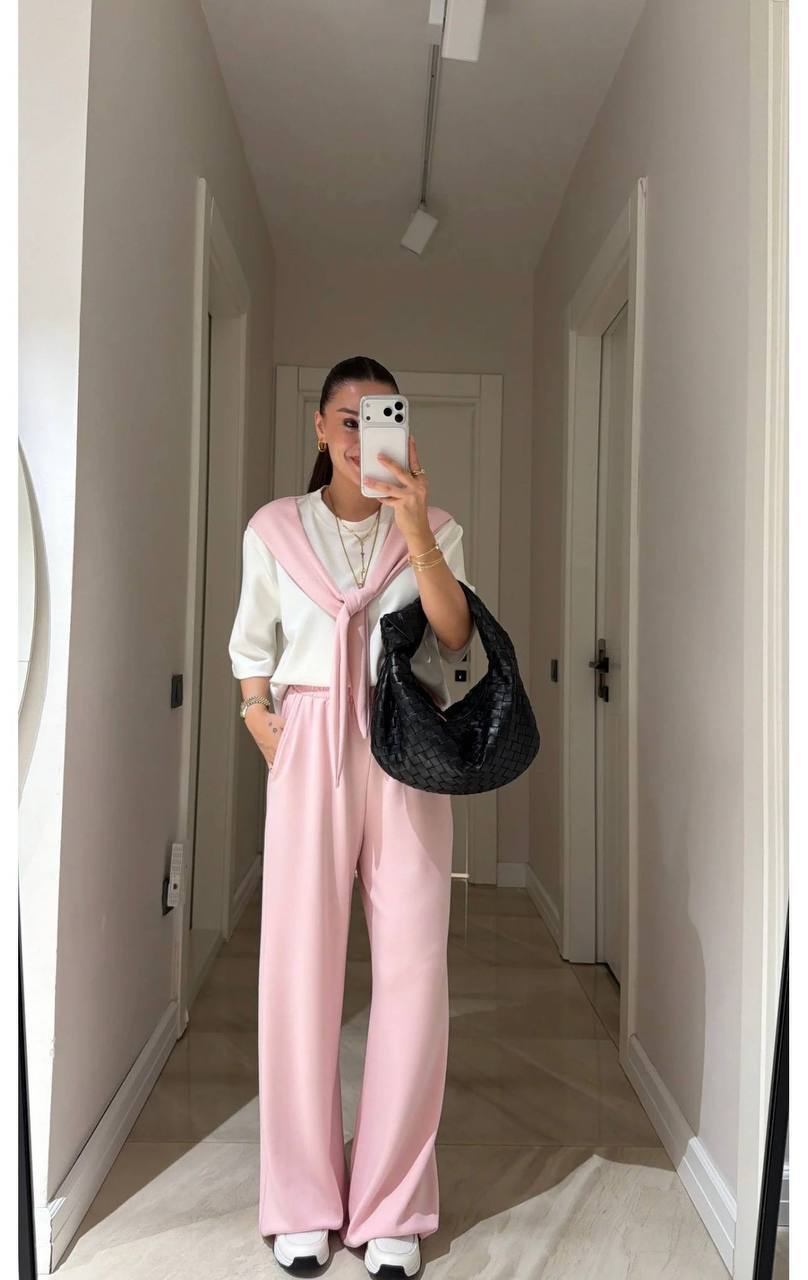 Женский Костюм Комплект Двойка – Белая Футболка с Имитацией Кофты на Плечах + Розовые Широкие Штаны