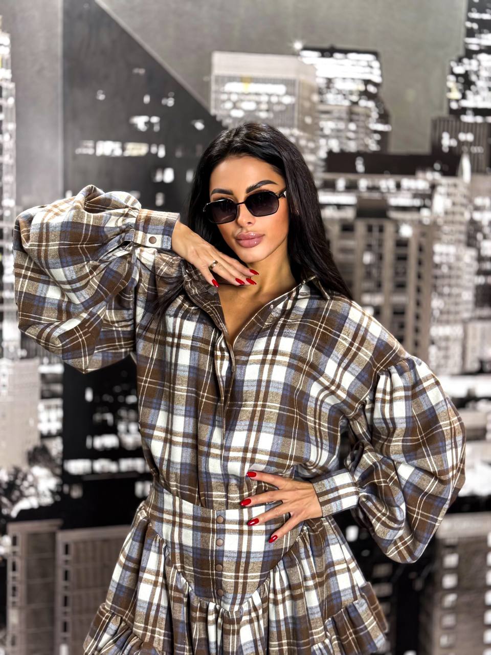 Женский Коттоновый Коричневый Костюм в Клеточку – Рубашка + Юбка