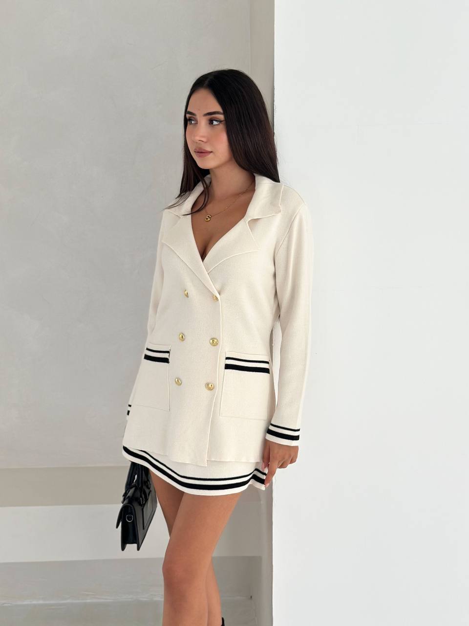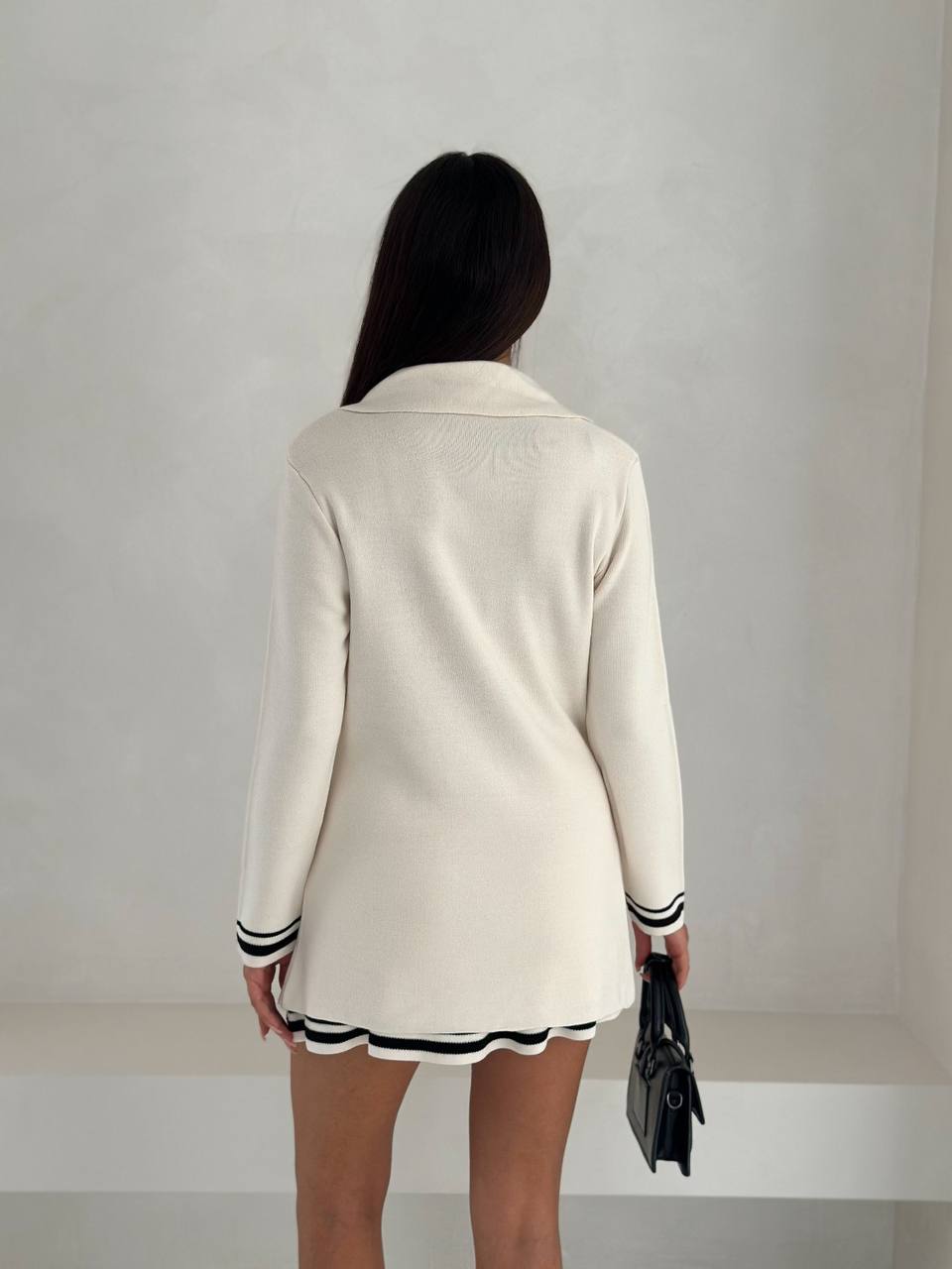 Женский Молочный Костюм с Контрастной Окантовкой – Жакет на Пуговицах + Юбка Мини