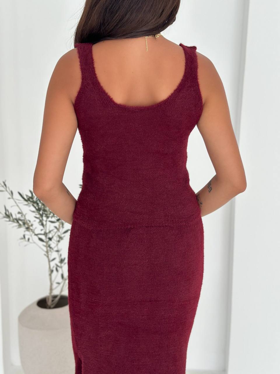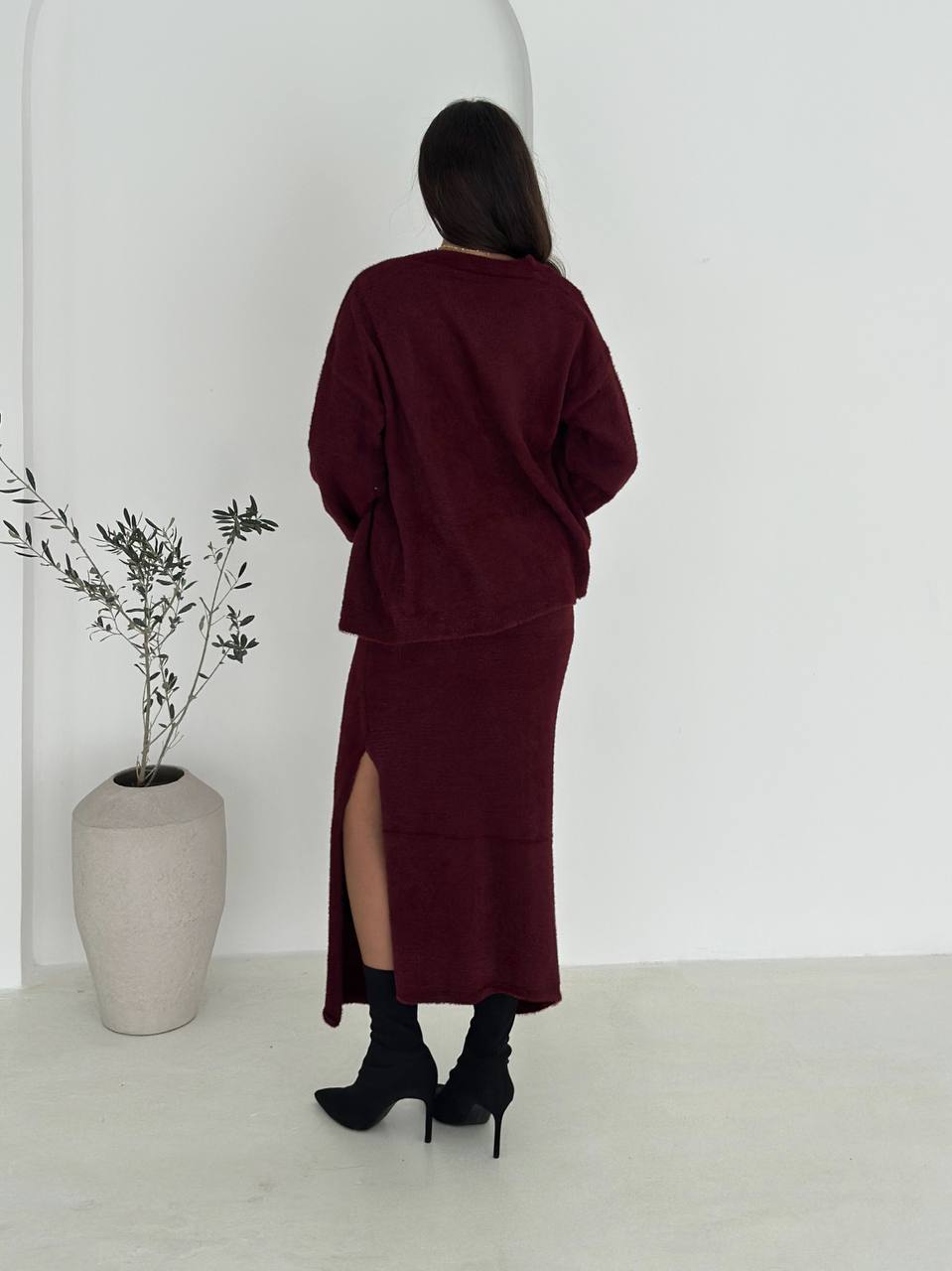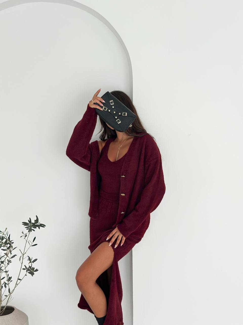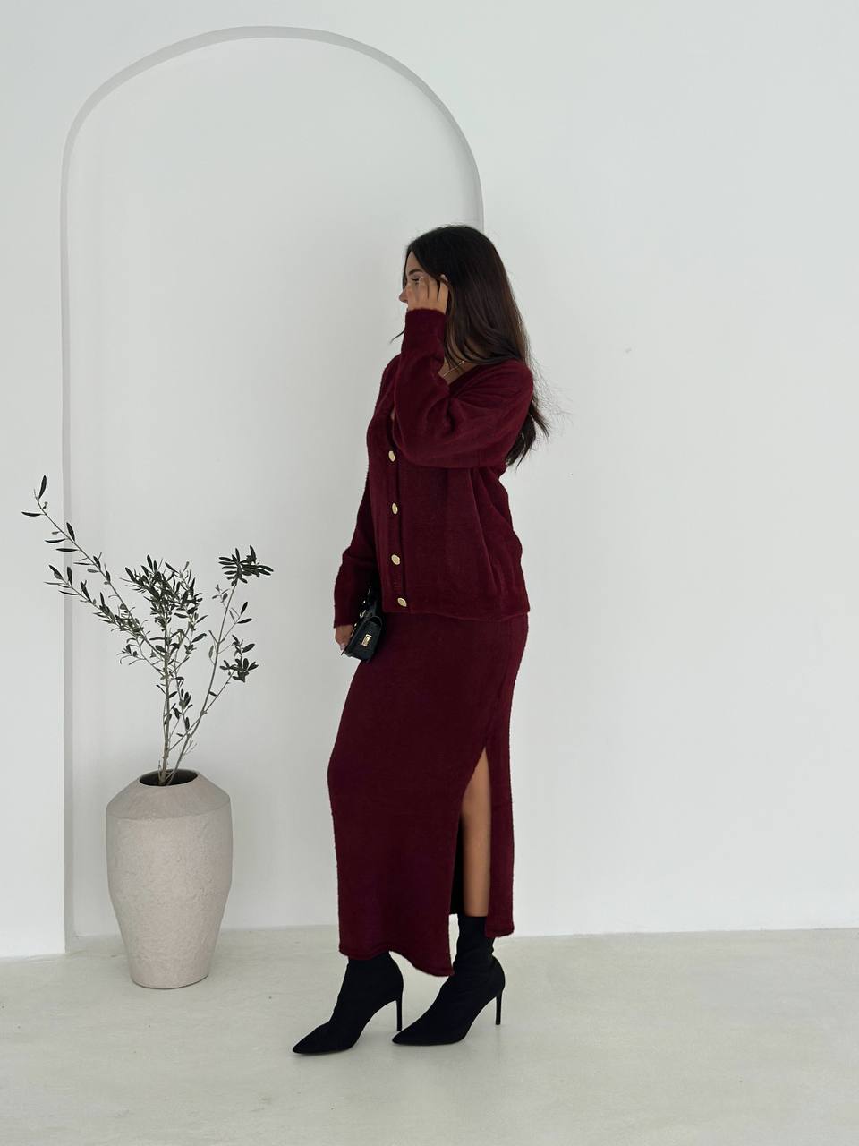 Женский Мягкий Ворсистый Бордовый Костюм Тройка – Кардиган + Топ + Юбка Миди с Разрезом