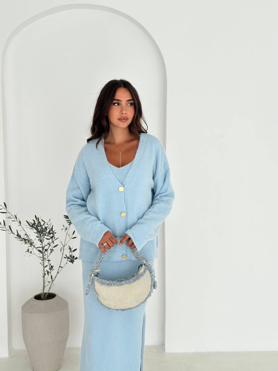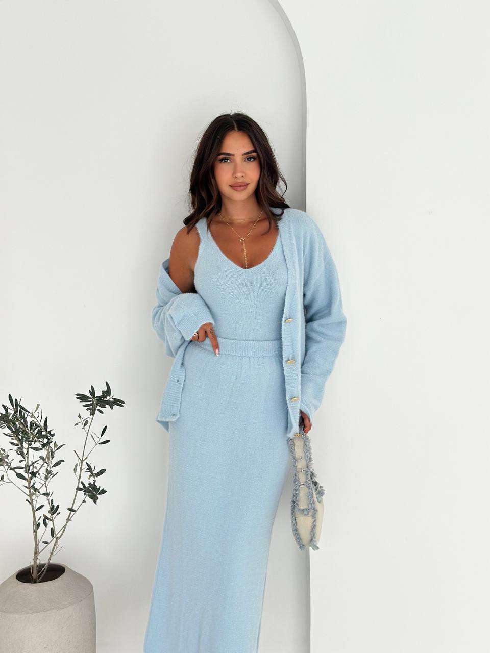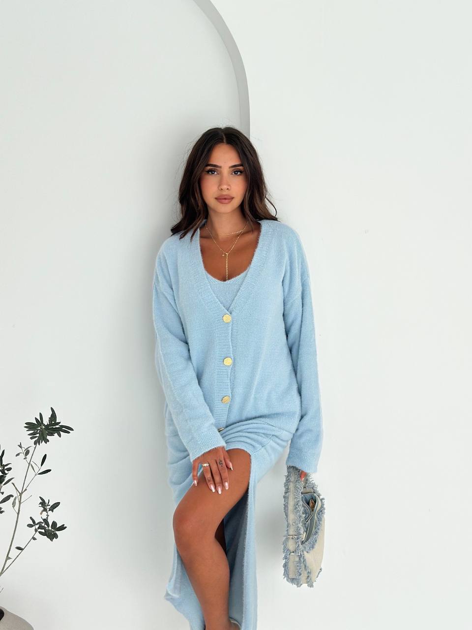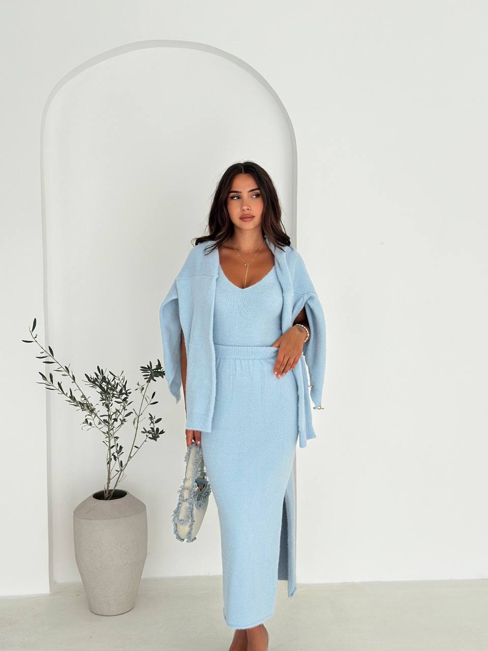 Женский Мягкий Ворсистый Голубой Костюм Тройка – Кардиган + Топ + Юбка Миди с Разрезом