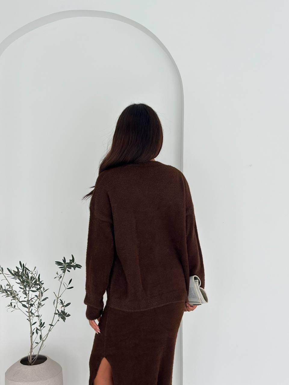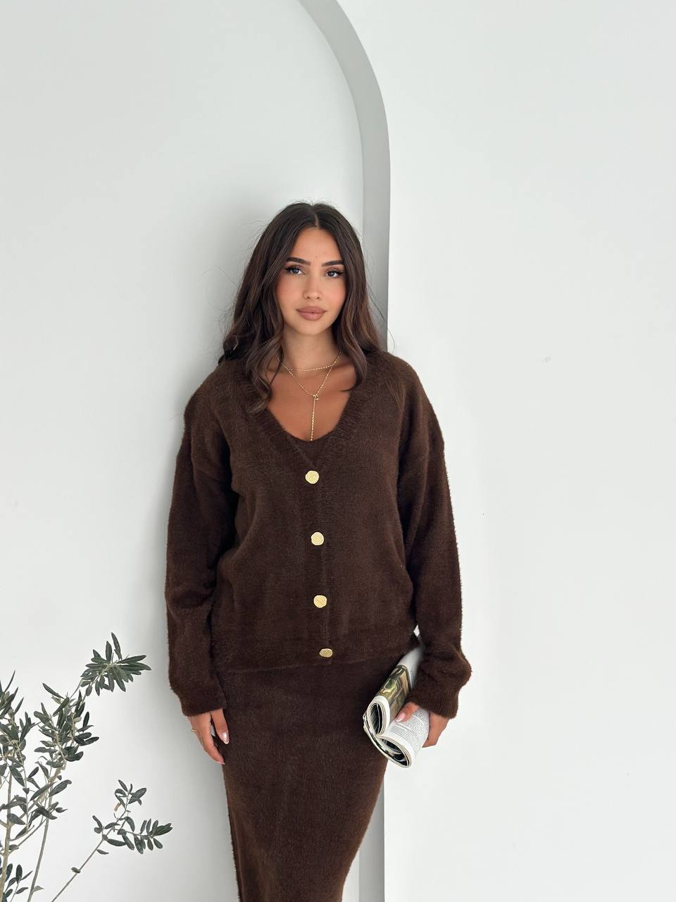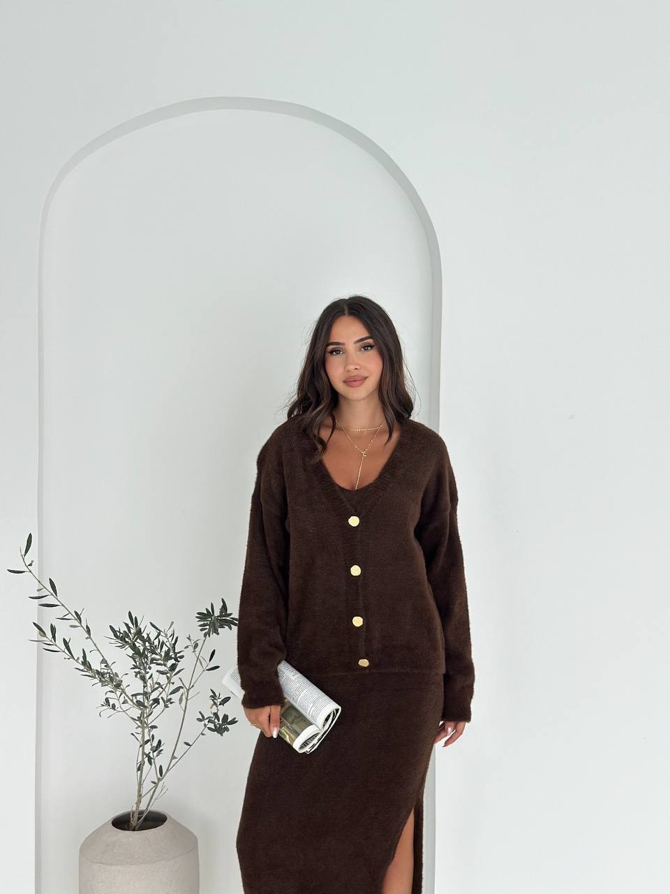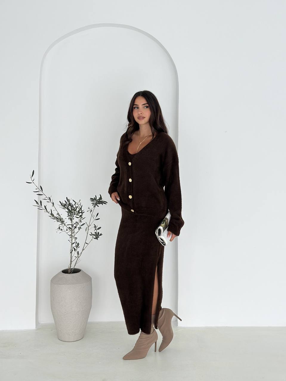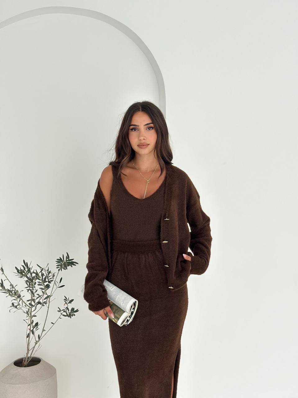 Женский Мягкий Ворсистый Коричневый Костюм Тройка – Кардиган + Топ + Юбка Миди с Разрезом