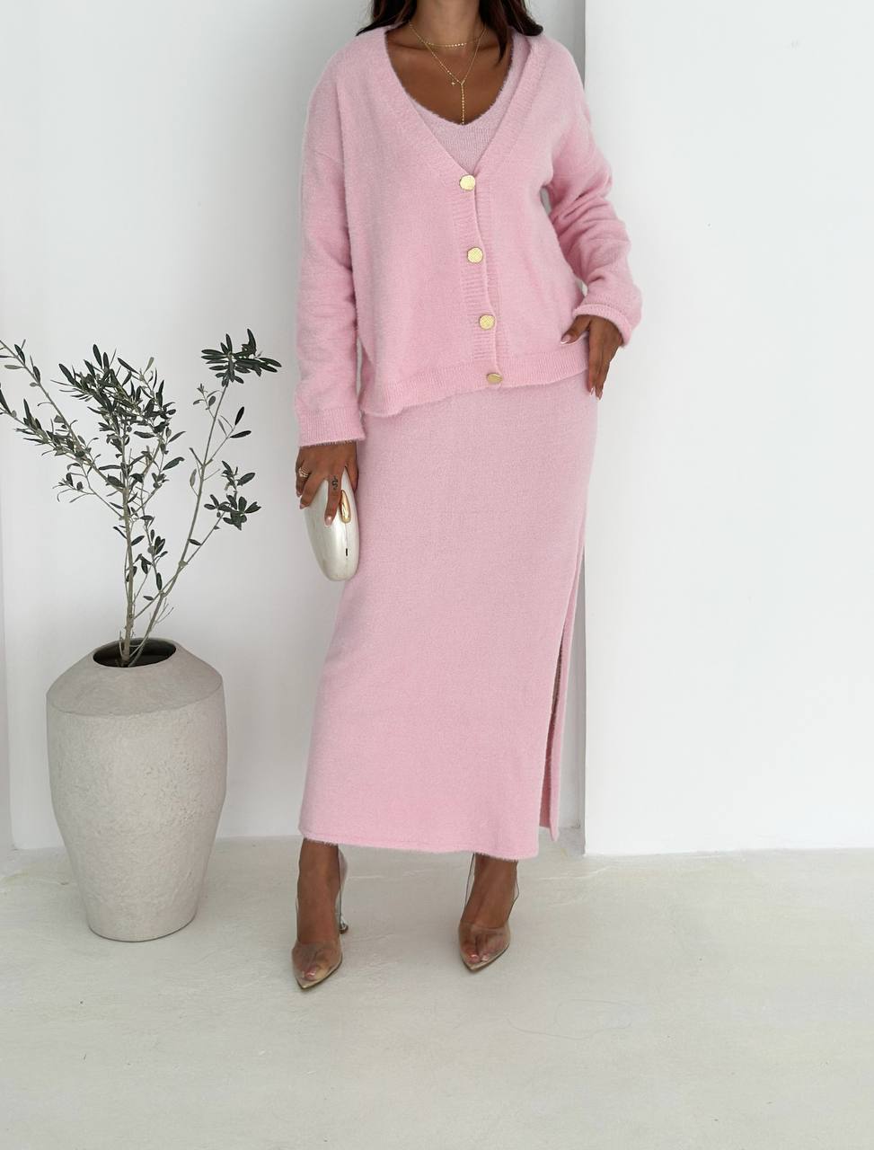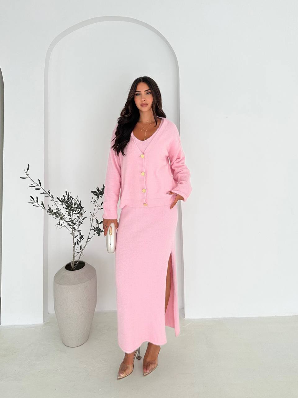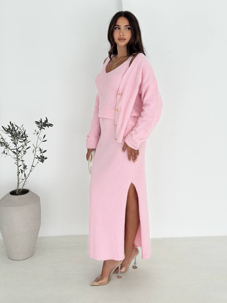 Женский Мягкий Ворсистый Розовый Костюм Тройка – Кардиган + Топ + Юбка Миди с Разрезом