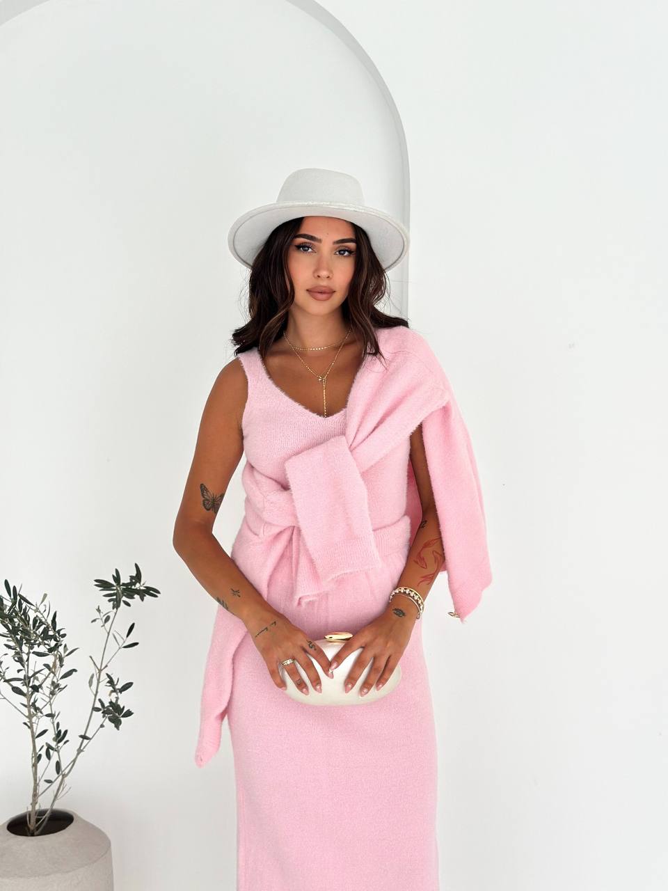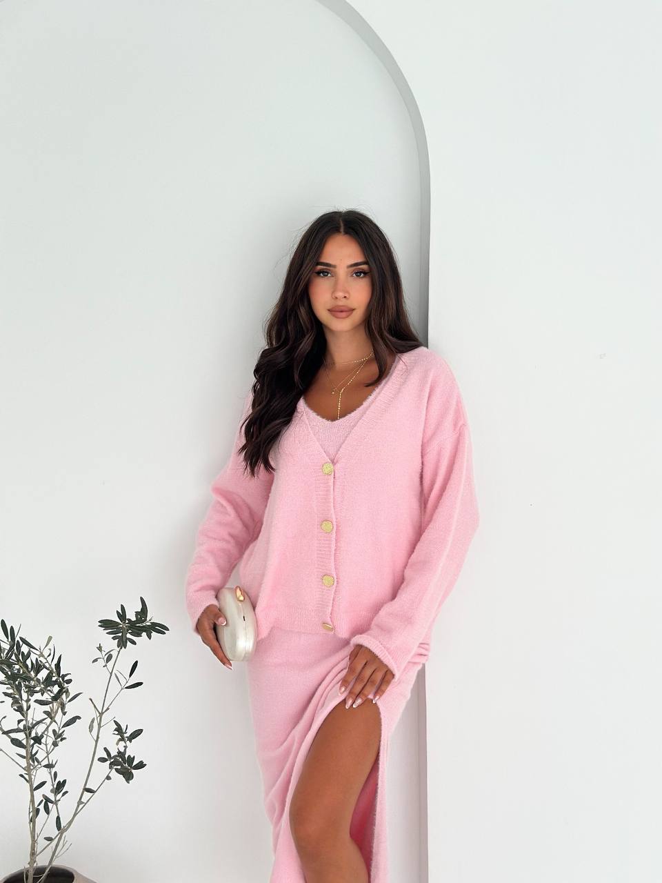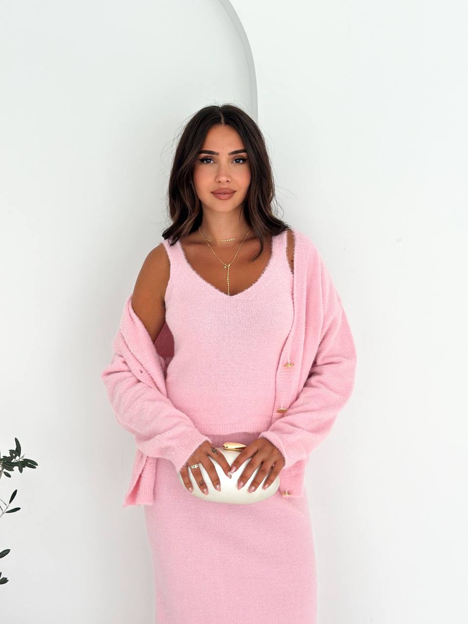 Женский Мягкий Ворсистый Розовый Костюм Тройка – Кардиган + Топ + Юбка Миди с Разрезом