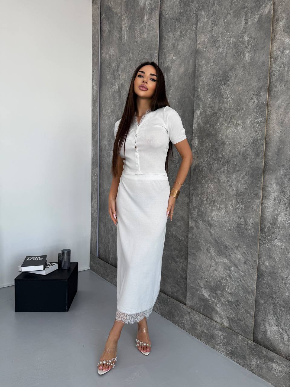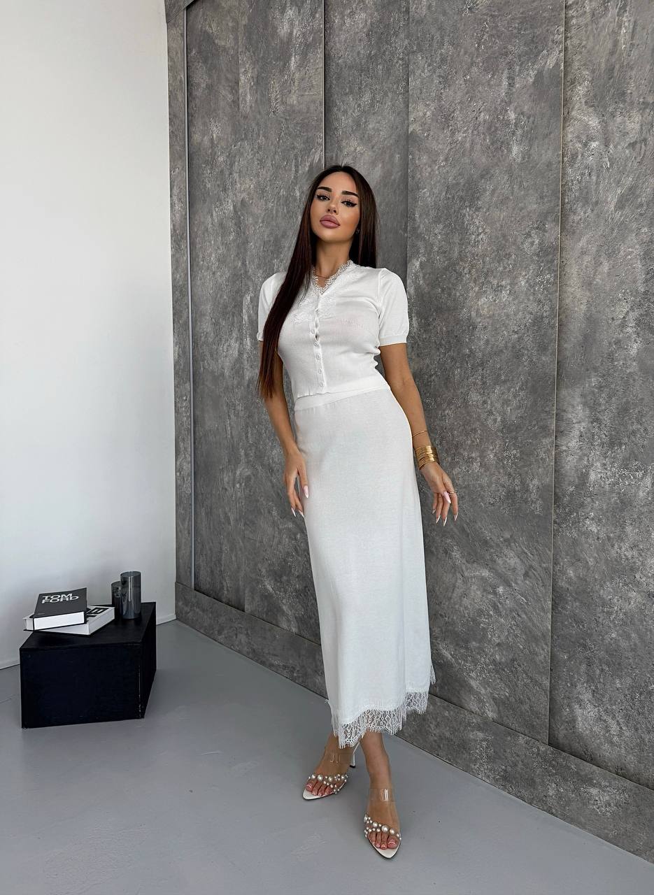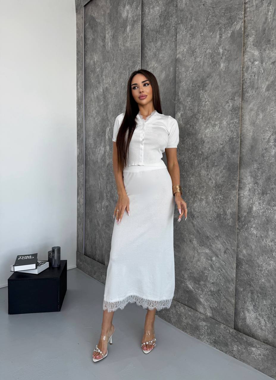 Женский Нежный Белый Костюм Двойка с Кружевом – Топ на Пуговицах + Юбка Миди