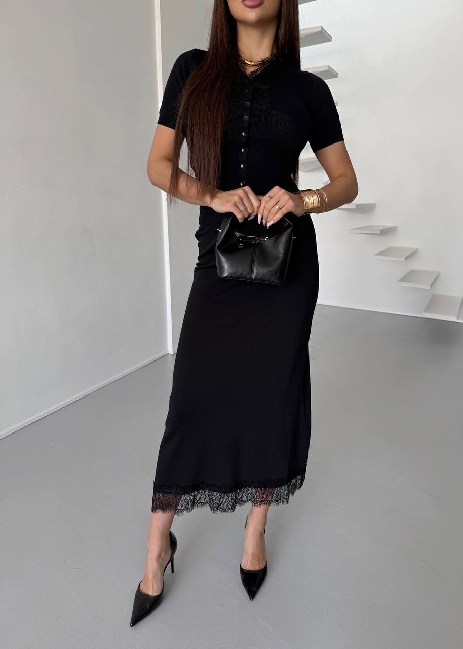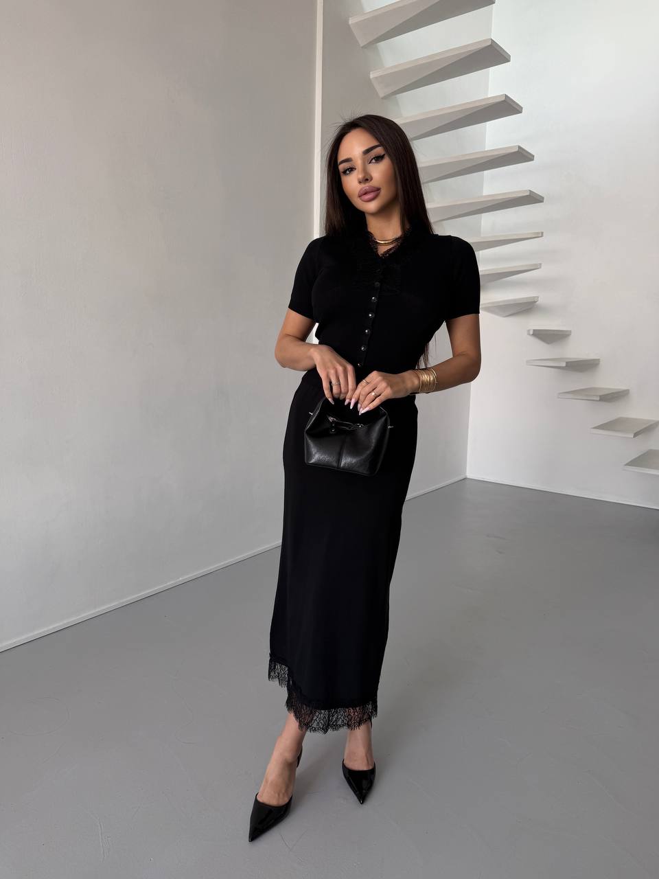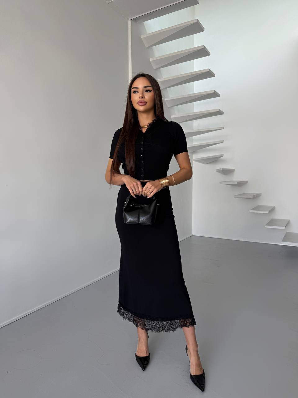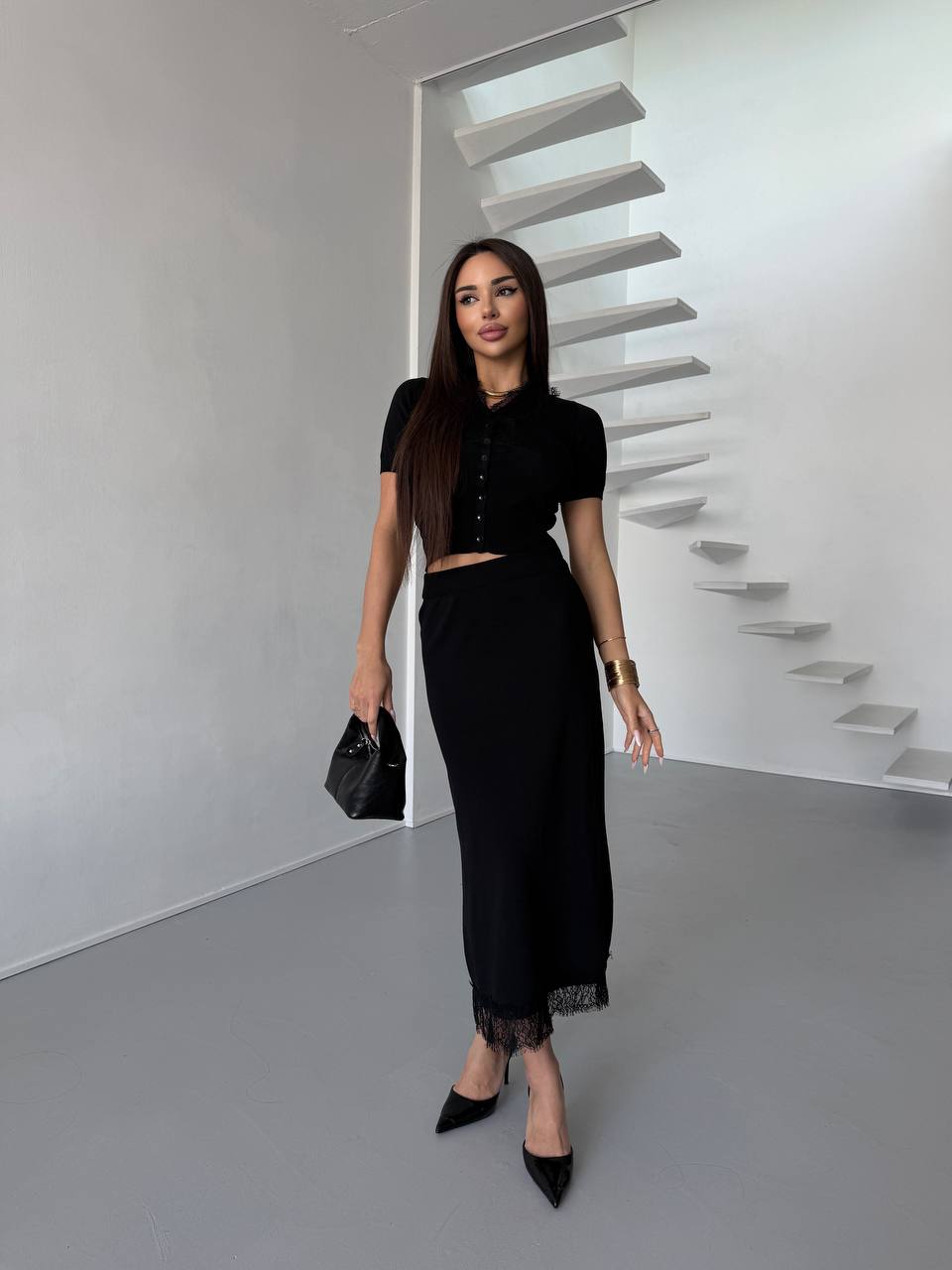 Женский Нежный Черный Костюм Двойка с Кружевом – Топ на Пуговицах + Юбка Миди