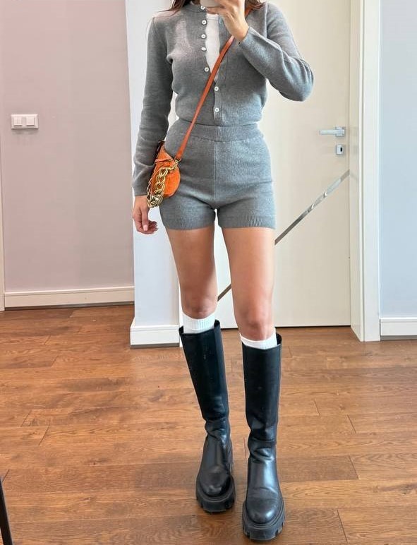Женский Серый Комплект Двойка – Боди с Длинными Рукавами + Шорты