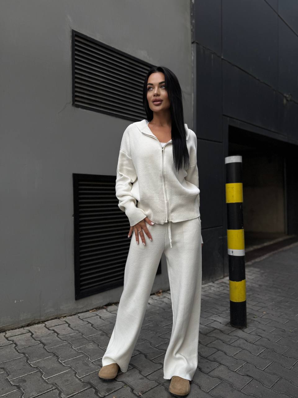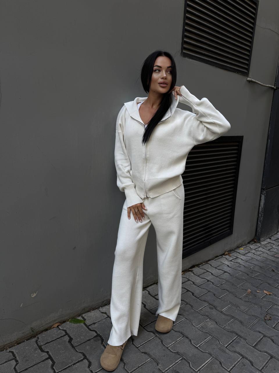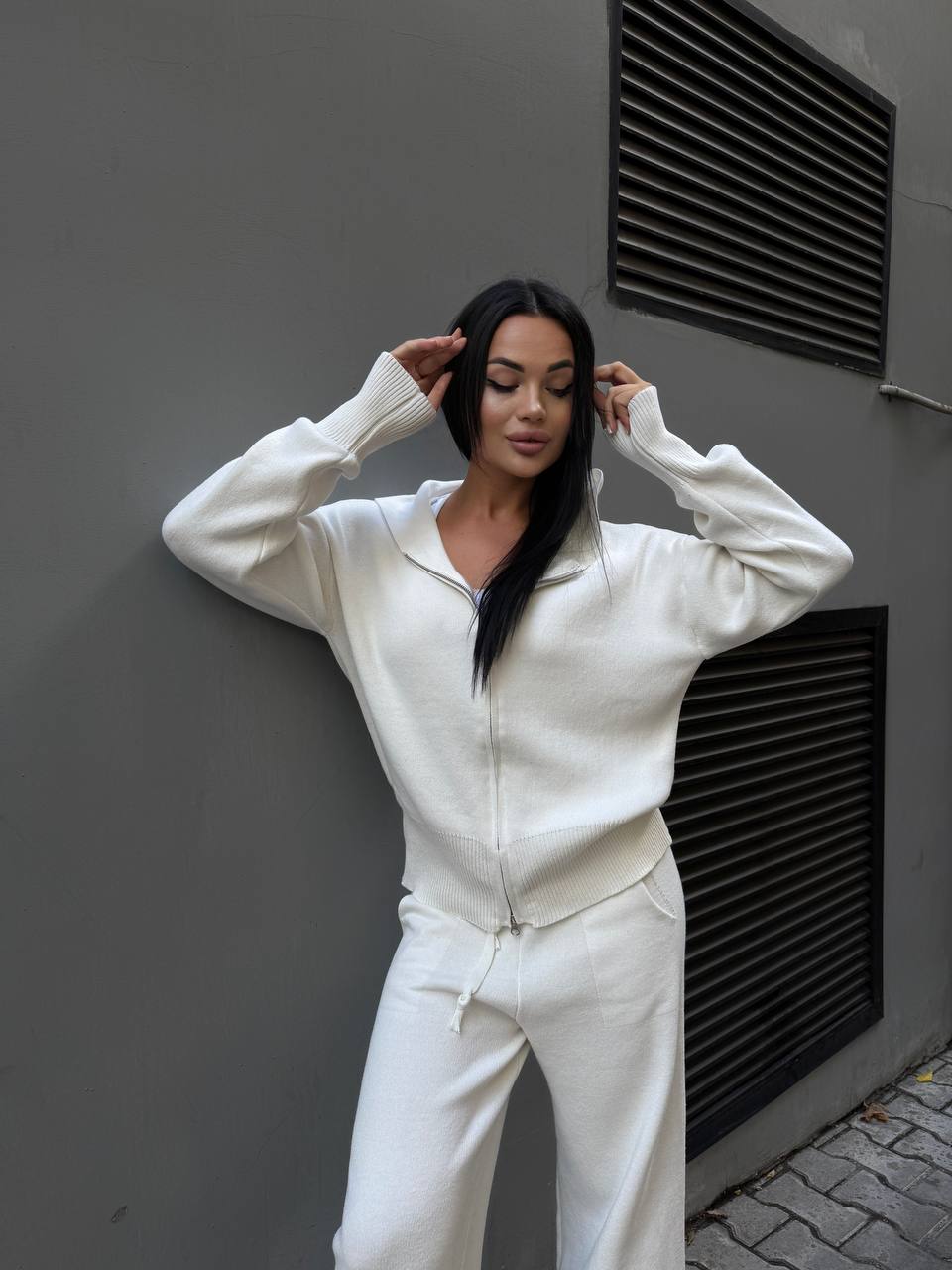 Женский Свободный Трикотажный Белый Костюм Двойка – Джемпер на Молнии + Штаны Палаццо