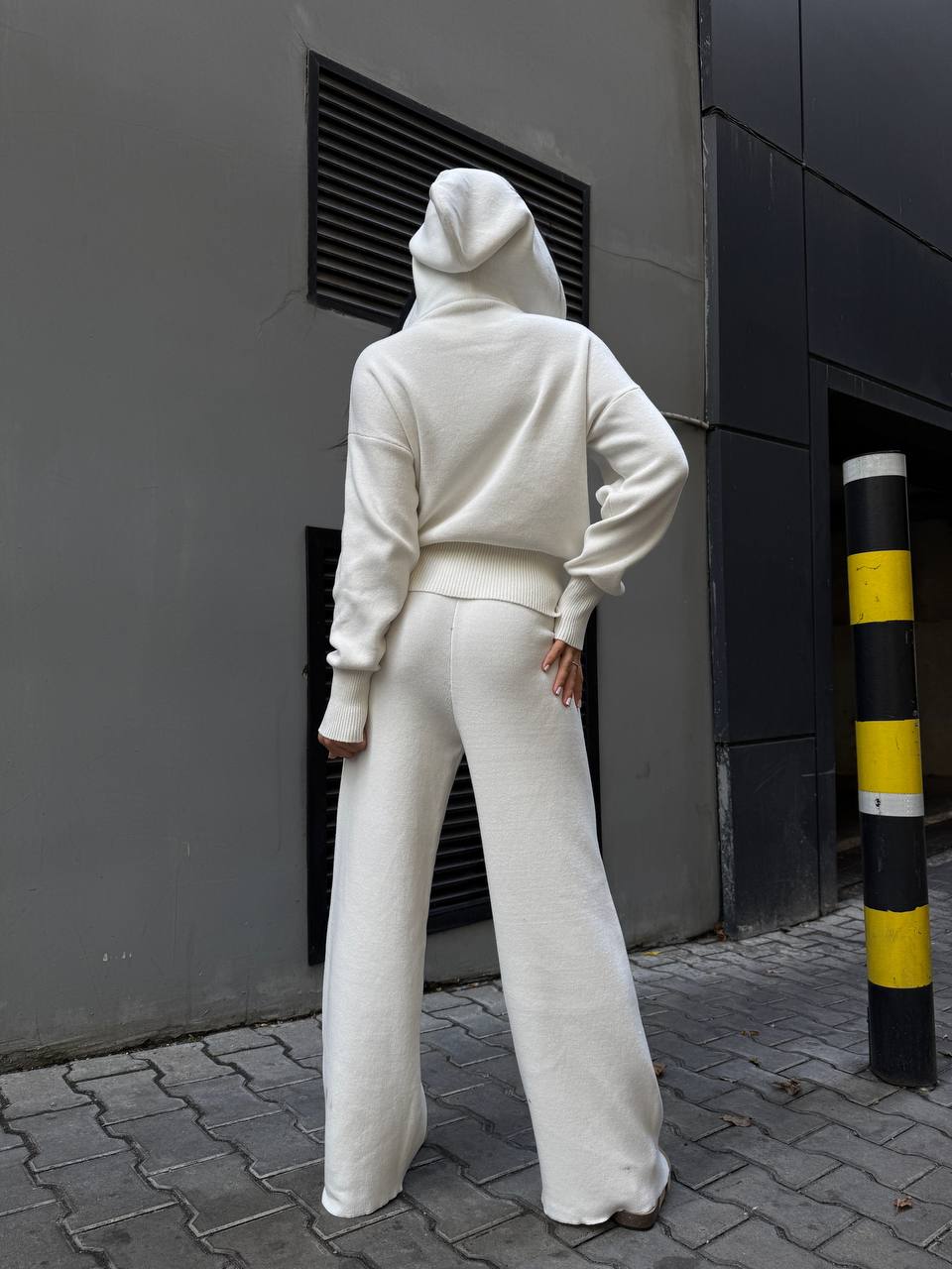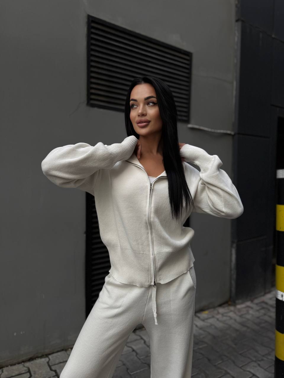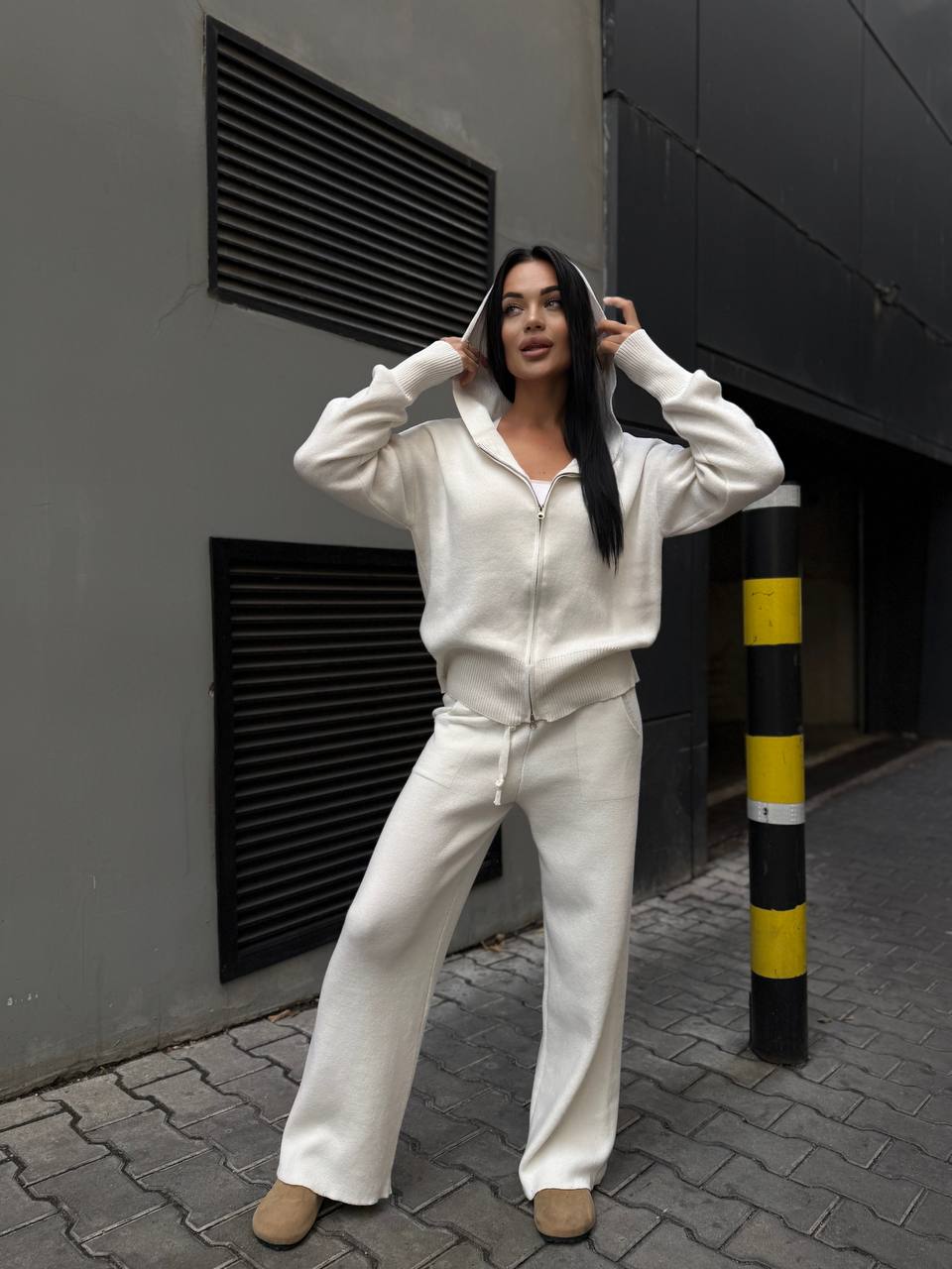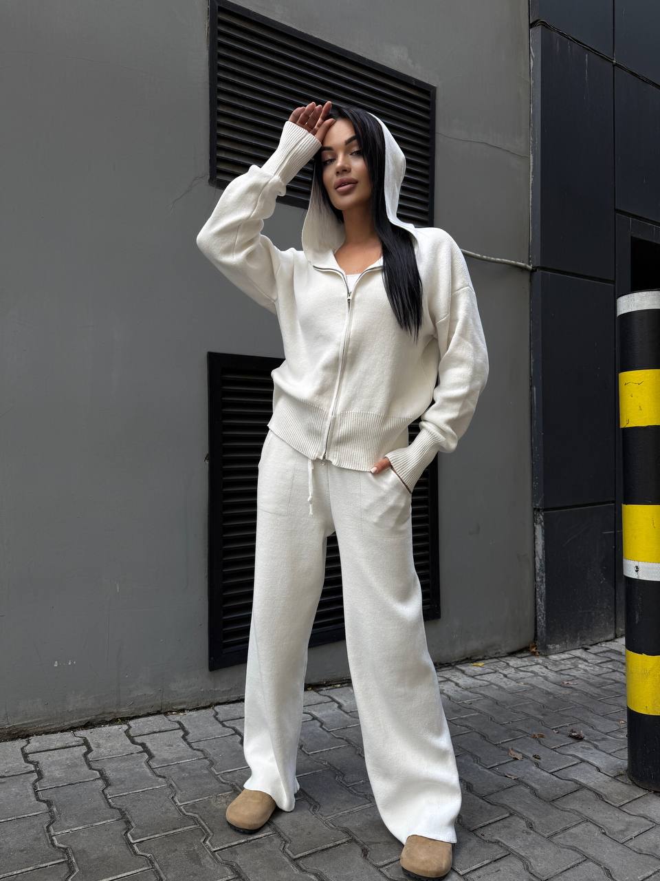 Женский Свободный Трикотажный Белый Костюм Двойка – Джемпер на Молнии + Штаны Палаццо