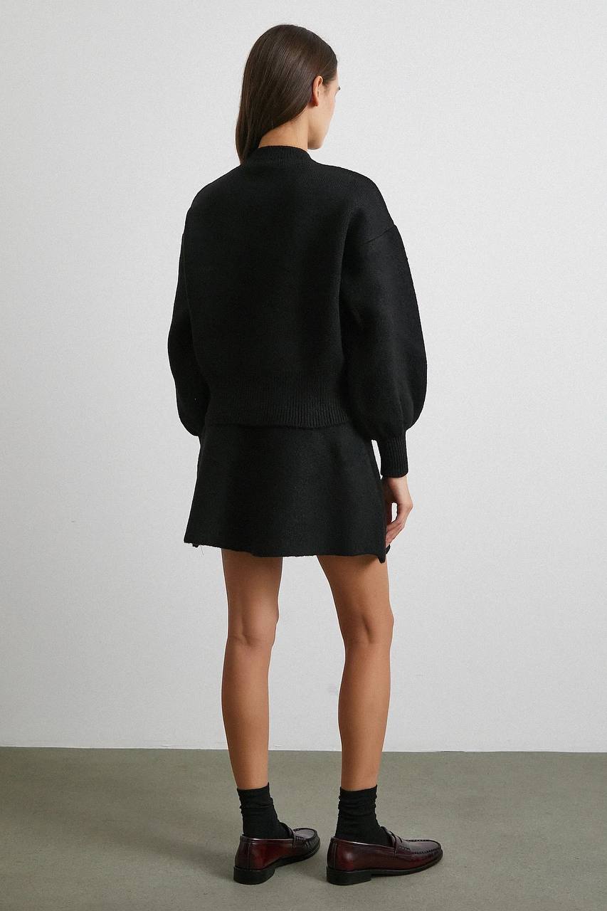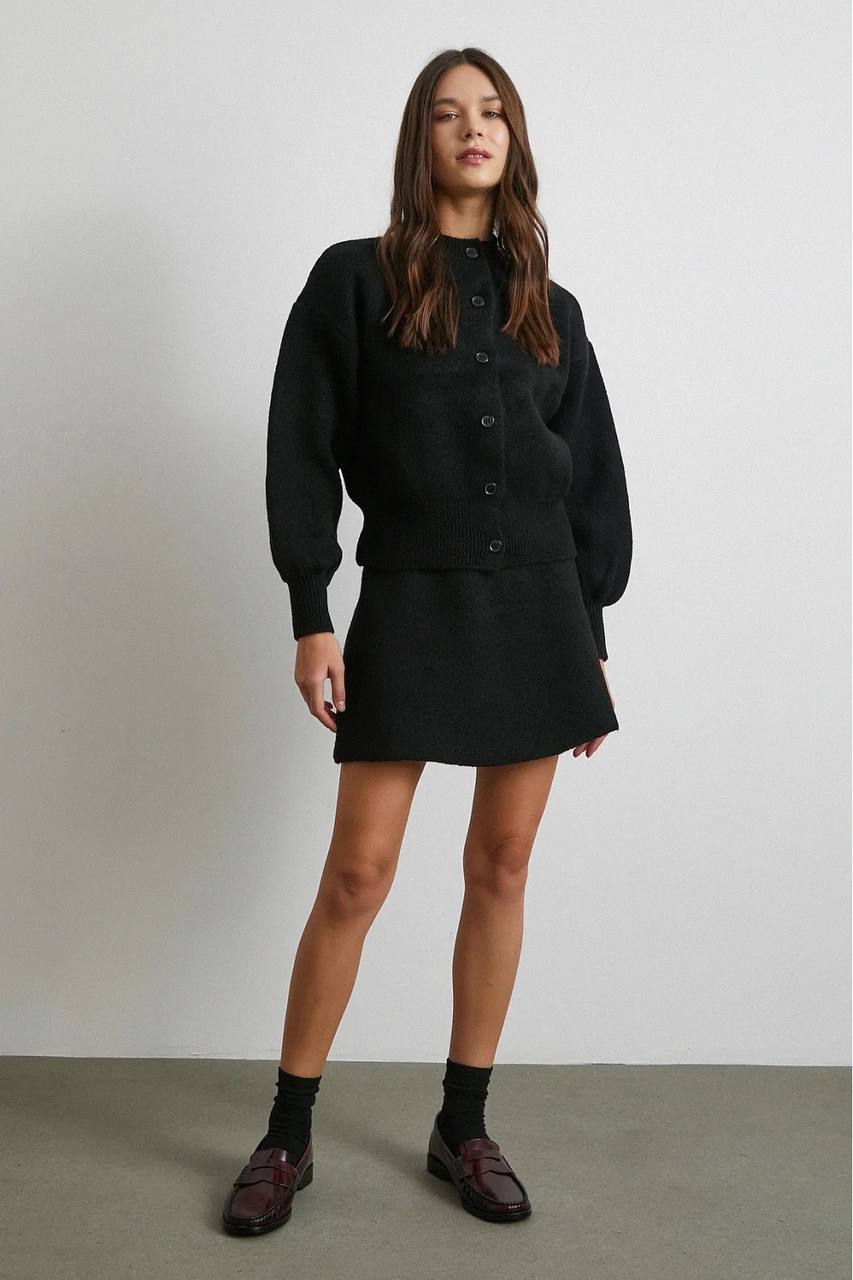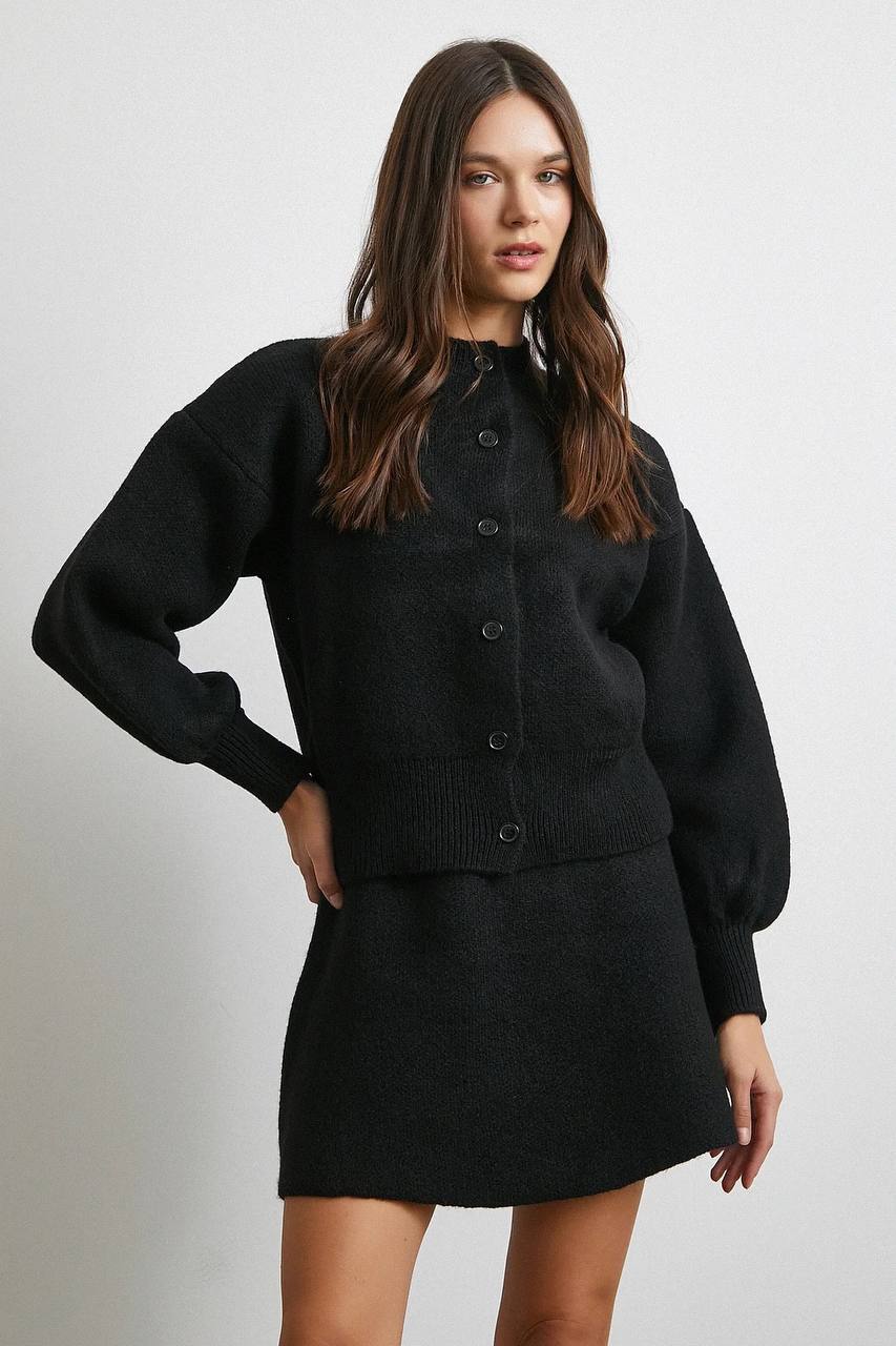 Женский Теплый Черный Костюм Двойка – Кардиган с Объемными Рукавами + Юбка Трапеция Мини